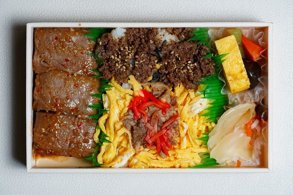 山形牛の通信販売を行う横浜市富岡の精肉店が出した東京都銀座の牛肉料理屋が、東京駅限定で販売する牛肉弁当なのだとか。実物でも店舗でも宣伝がないため、単なるデパ地下弁当にしか見えない。脂質も味付けも分量もあっさりとしたおとなしい感じで、叙々苑や米沢駅の駅弁に比べ、デザインも含めて地味な印象。購入後ほどなく販売を終了したとも聞く。