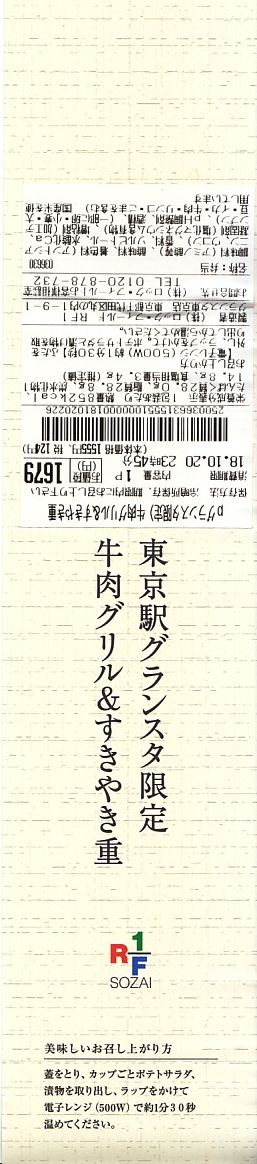 JR東日本のエキナカでもよく見掛け、日本中すべての百貨店のデパ地下に出店しているのではないかと思う「R1/F SOZAI」の牛肉弁当。掛紙に「東京駅グランスタ限定」と書いてあったので買ってみた。見た目は焼肉丼と牛丼のセット。2区画の白御飯の一方を3枚の牛焼肉とポテトサラダで覆い、他方を牛肉煮と焼豆腐と漬物類で覆うもの。作りたてのおいしい惣菜。