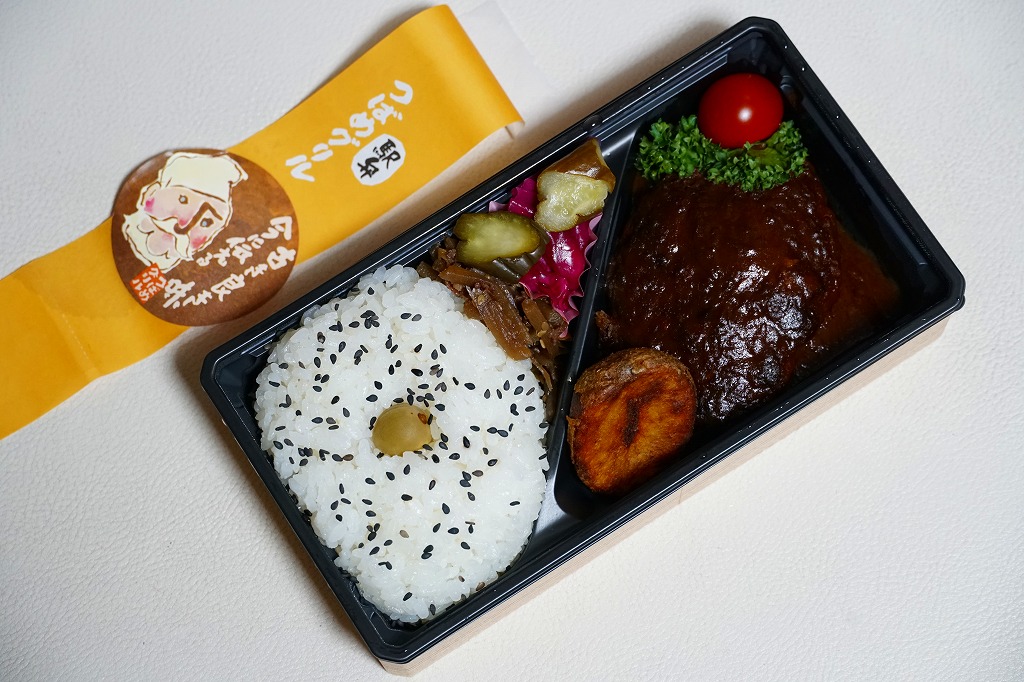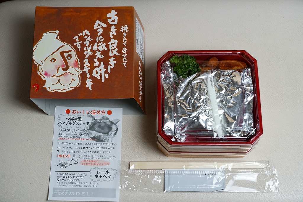 他店舗では商品名を書いた樹脂テープで容器を留めるところを、この店舗では「駅弁」「つばめグリル」とアイコンを載せた黄色い紙帯で容器を留める。すべての商品で紙帯は共通で、これは看板商品の「ハンブルグステーキ弁当」。長方形のプラ容器に、日の丸御飯、ハンバーグデミグラスソース、ポテト、プチトマト、パセリ、牛ごぼう、ピクルスを詰める。中身や味が他店と変わることはない、個人的に大好きな味。食堂でハンブルグステーキを注文しても、だいたい同じ内容と風味になる。