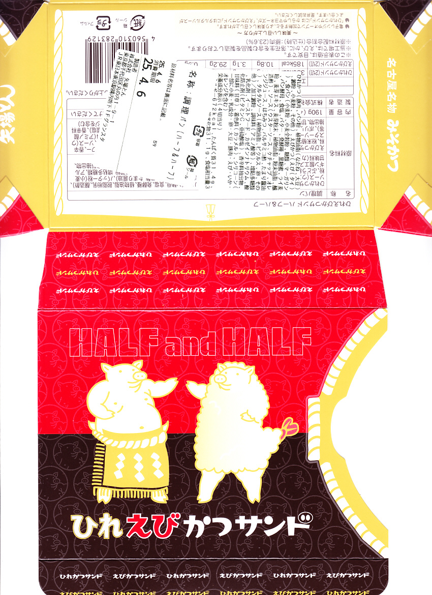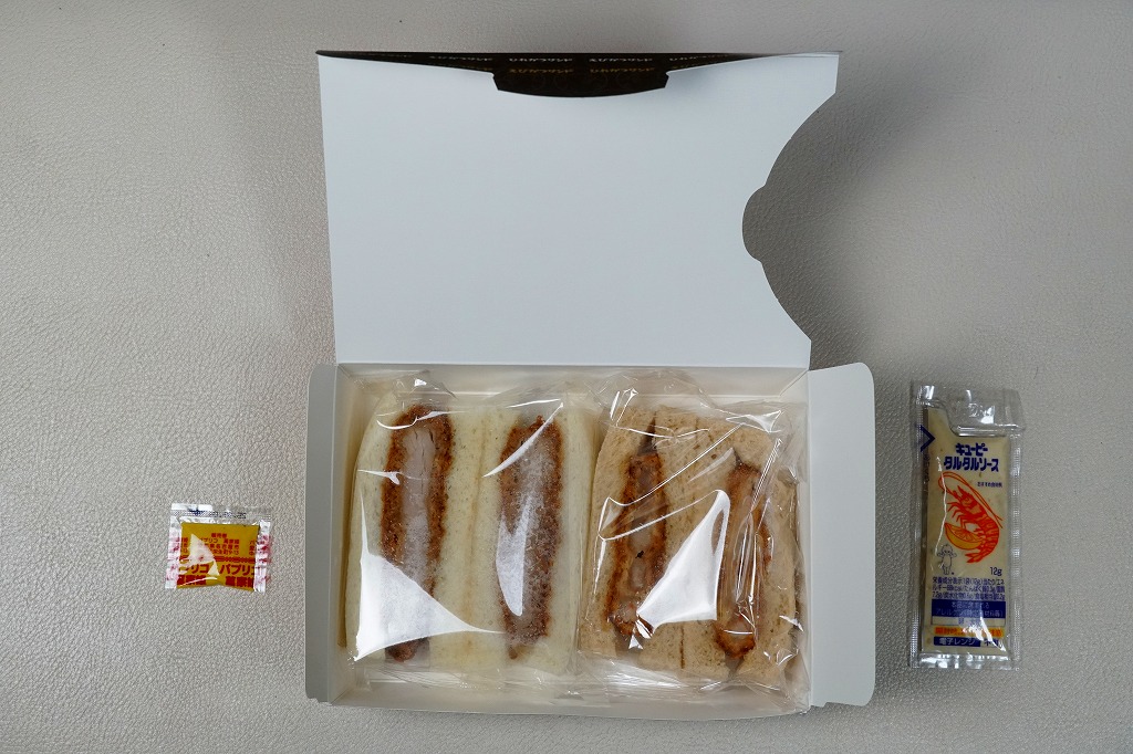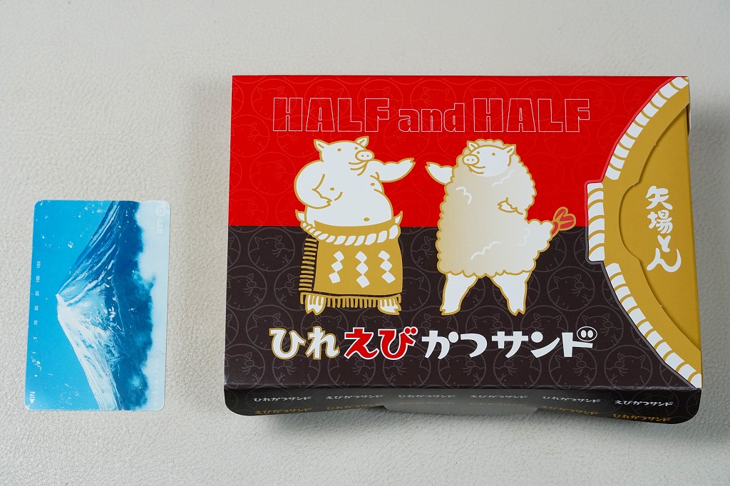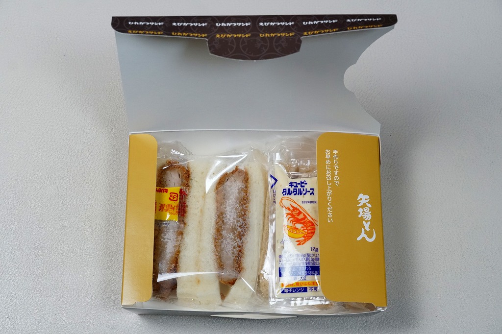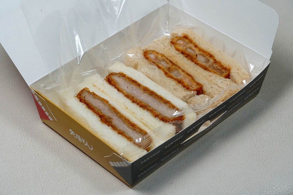 ブタを相撲取り姿とエビフライ衣装で描いた専用の紙箱に、ひれカツサンドを2切れ、えびかつサンドを2切れ、それぞれ袋詰めして詰めて、辛子とタルタルソースを添付する。同社で既存のひれカツサンドと、JR名古屋駅店限定で2021年9月に売り出したというえびかつサンドの詰合せ。矢場とんのファンでなければ、普通においしいコンパクトなカツサンド。