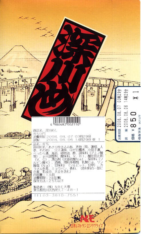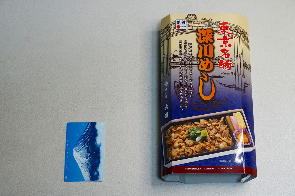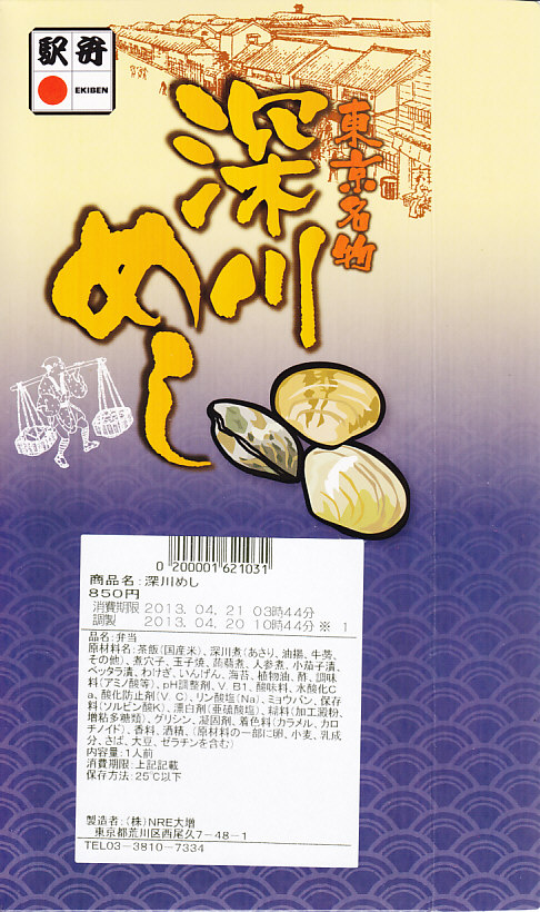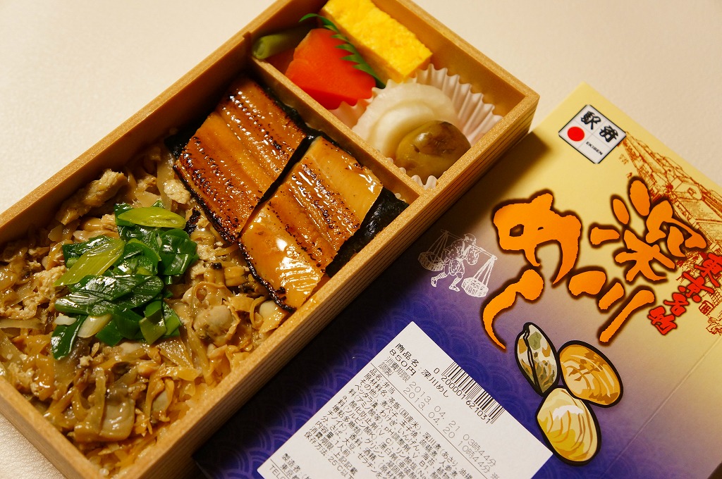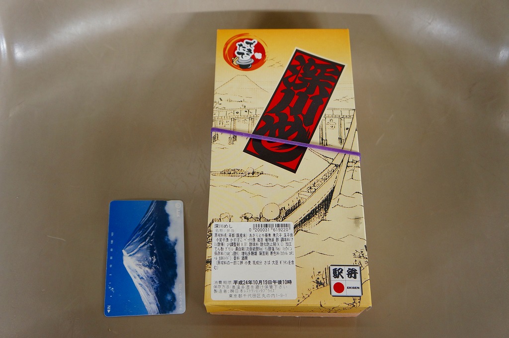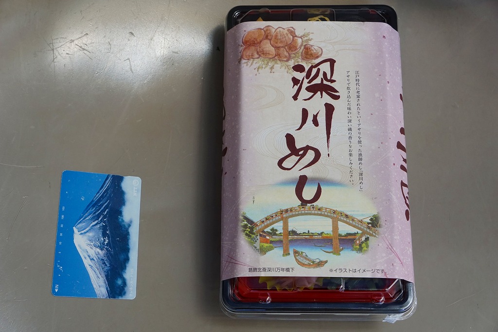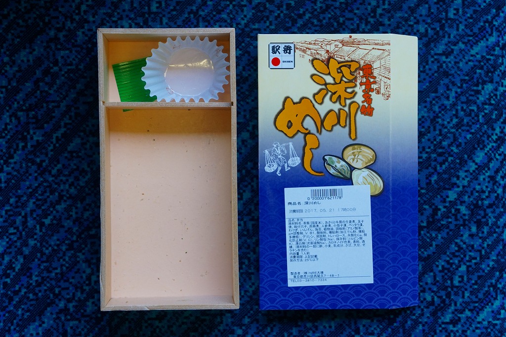 深川飯の駅弁については、JR東日本の子会社である日本レストランエンタプライズ(NRE)と、JR東海の子会社であるジェイアール東海パッセンジャーズ(JRCP)でほとんど同じ商品を出しており、東京エリアでそれぞれの駅構内にて販売している。これは在来線コンコースで買ったNRE版。