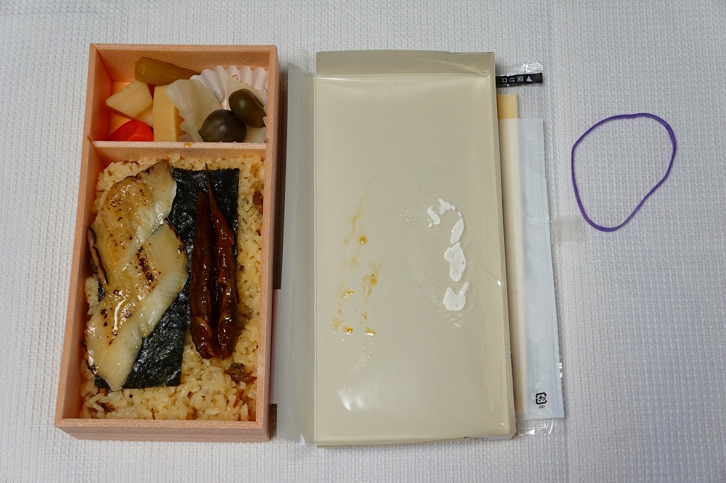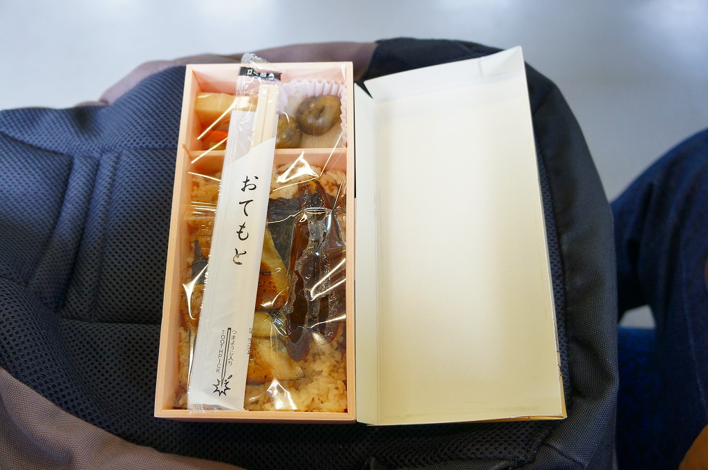 デパ地下弁当タイプのプラ容器に透明なふたをして、商品名と木橋を描いた桃色の掛紙で巻く。中身は茶飯をアサリ煮と焼アサリ串と錦糸卵で覆い、タケノコとシイタケも載せ、山菜と大根桜漬を添える。味は淡泊で、付合せも滋味がなく、業務用冷凍食品の多用を感じ、在来線のNRE(日本レストランエンタプライズ)や東海道新幹線のJRCP(ジェイアール東海パッセンジャーズ)の東京駅弁より二段くらい落ちる印象。掛紙の絵柄とともに、寂しさのある落ち着き。