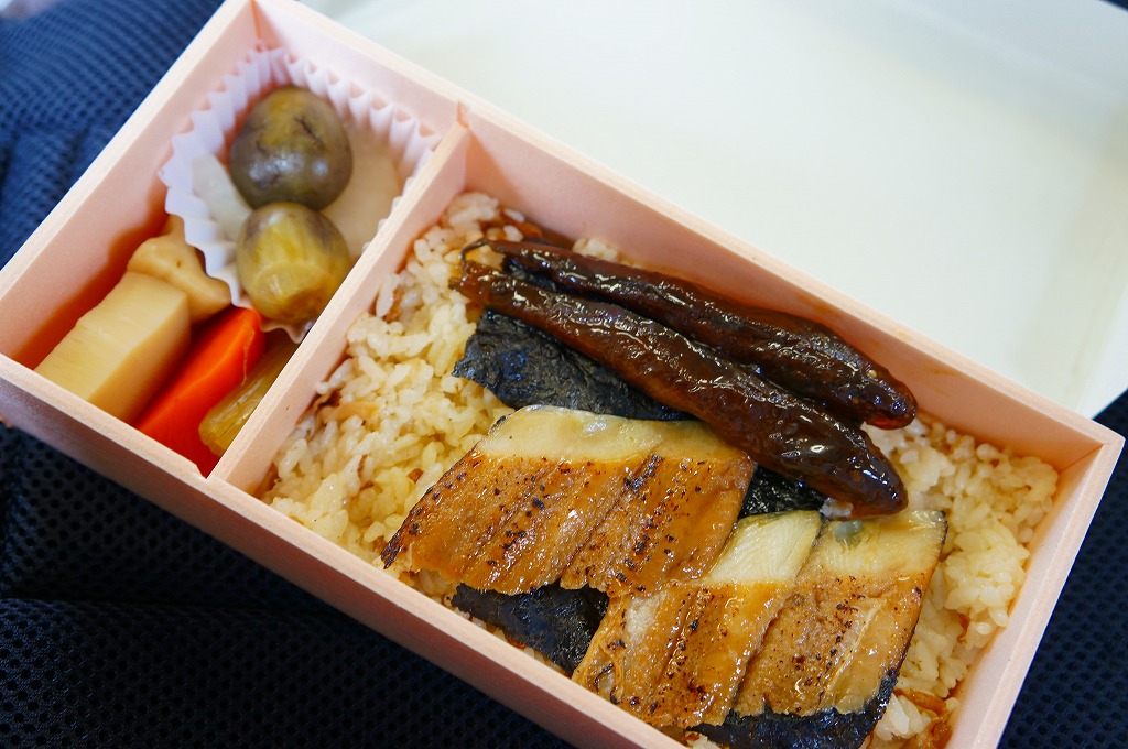 東京駅の名物駅弁「深川めし」の、2017(平成29)年時点での姿。2013(平成25)年のリニューアルで、2021(令和3)年9月までの販売。茶飯の上に海苔と煮アナゴと、「深川煮」なるアサリとゴボウと油揚げなどの煮物を載せてワケギを振り、小ナス漬、ベッタラ漬、玉子焼、ニンジンとコンニャクとインゲンの煮物を添えるという内容だった。リニューアル前よりも柔らかく美味くなったとも思うし、ハゼ甘露煮の省略を嘆く意見もあった。
