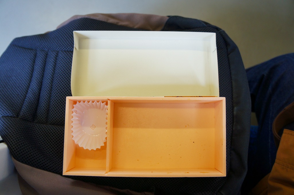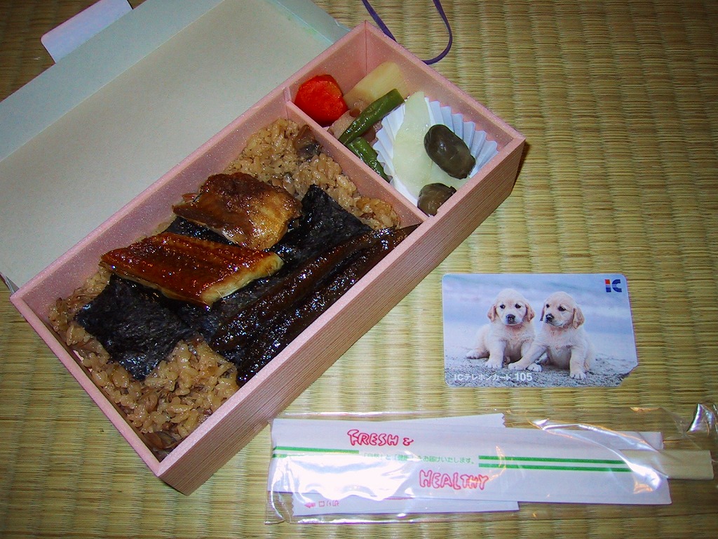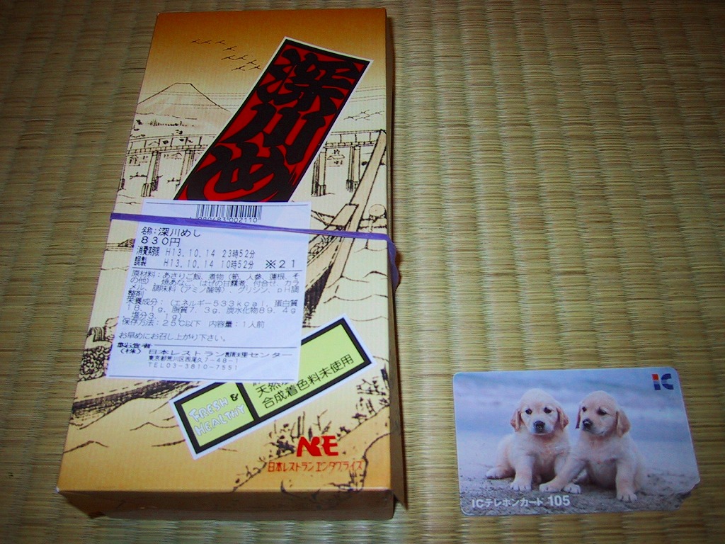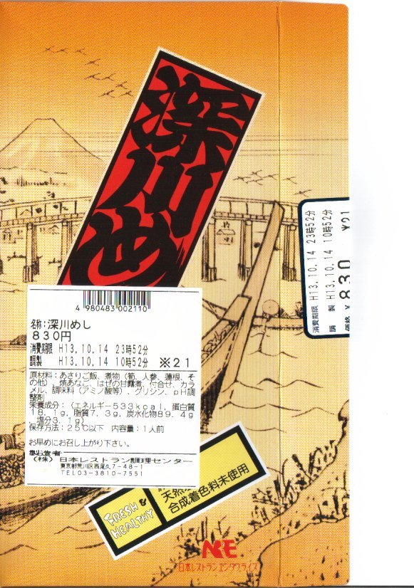 2001(平成13)年10月14日に購入した、東京駅弁のボール紙製パッケージ。上記の2008年時点のものと比べて、価格や製造者の名称など食品表示ラベルの内容が異なるが、その他に違いはほとんどない。