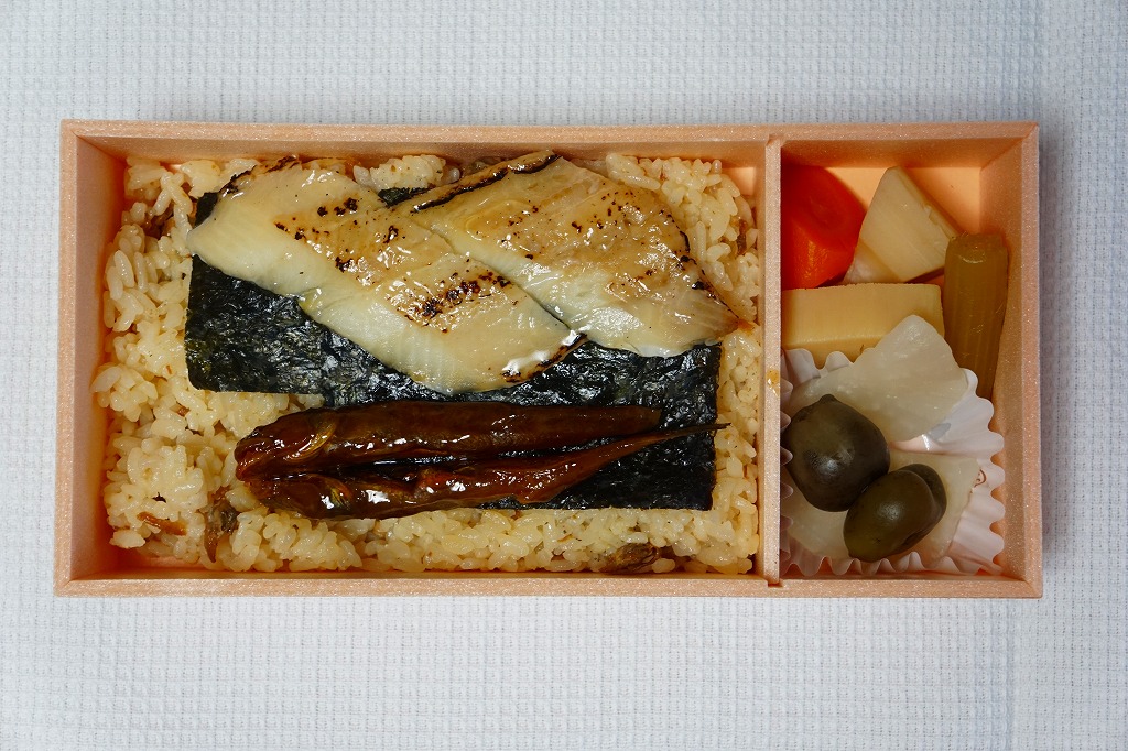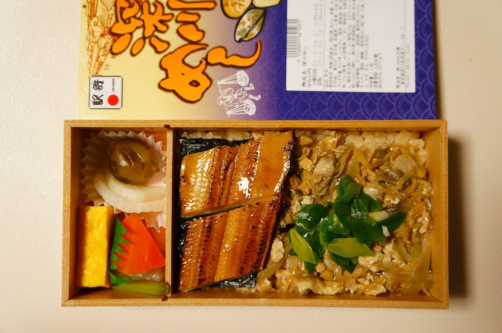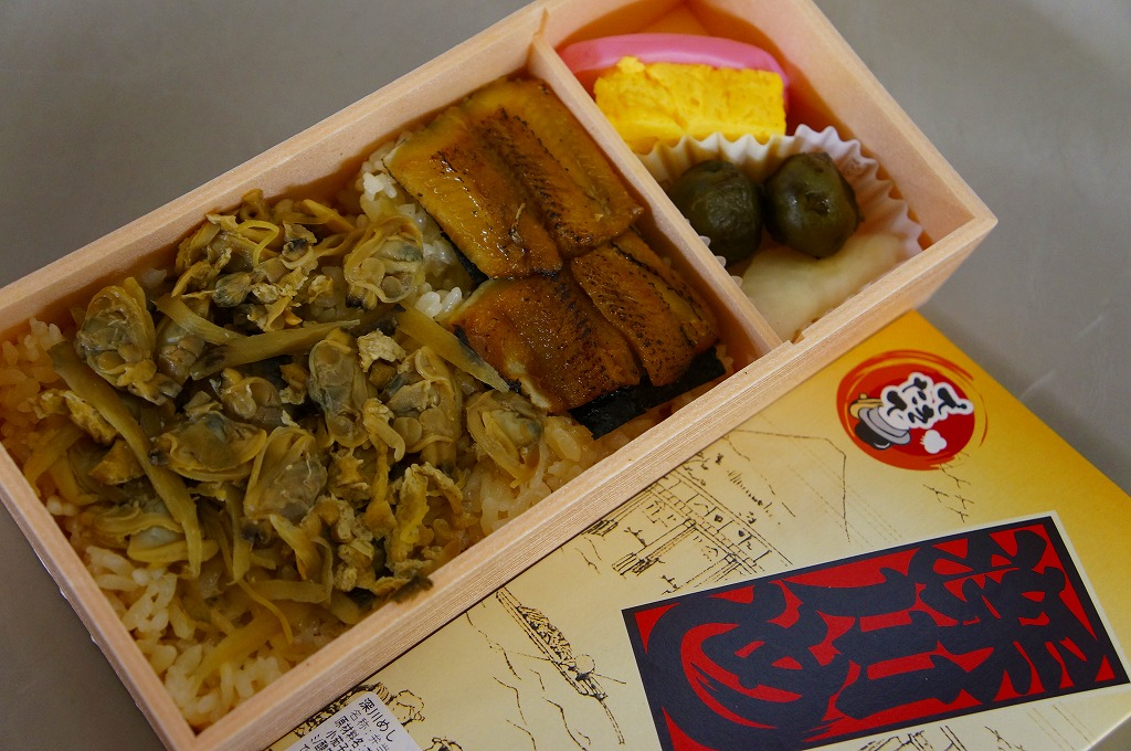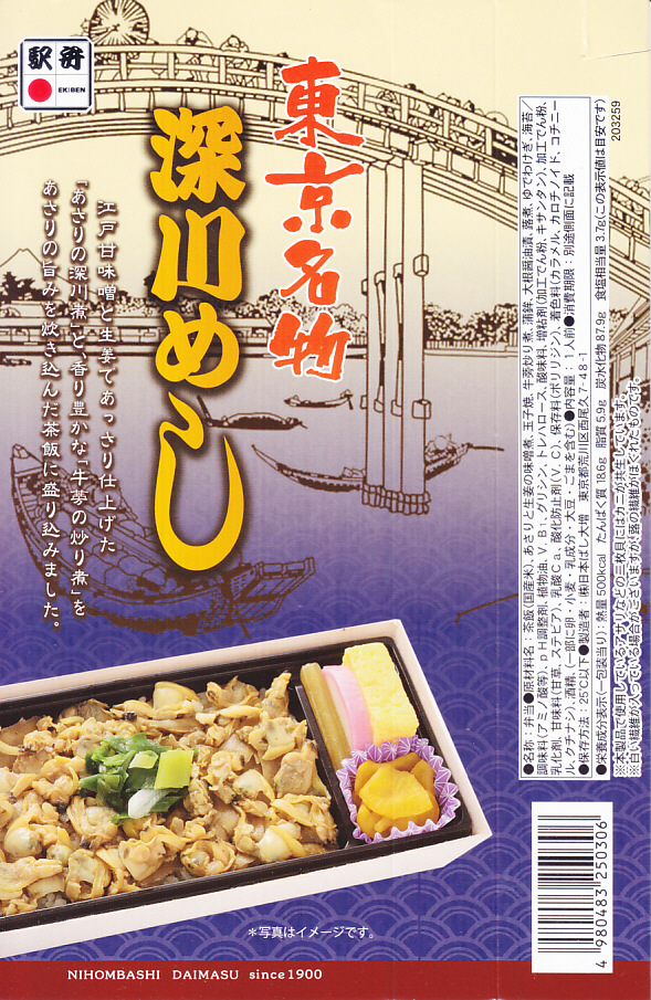 1987(昭和62)年に発売した、東京駅を代表する人気駅弁のひとつ。長方形の容器に江戸の風景を描いたボール紙でふたをして輪ゴムで留める。中身はアサリの炊込飯に海苔を敷いて、アナゴの蒲焼きとハゼの甘露煮を2個ずつ載せ、小ナス漬やべったら漬に煮物数個を添えるもの。現在の東京都江東区深川あたり、隅田川の河口周辺で江戸時代から親しまれた炊込飯を駅弁化したもの。2011年現在で一日あたり500個以上が売れているという。