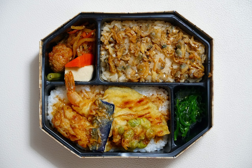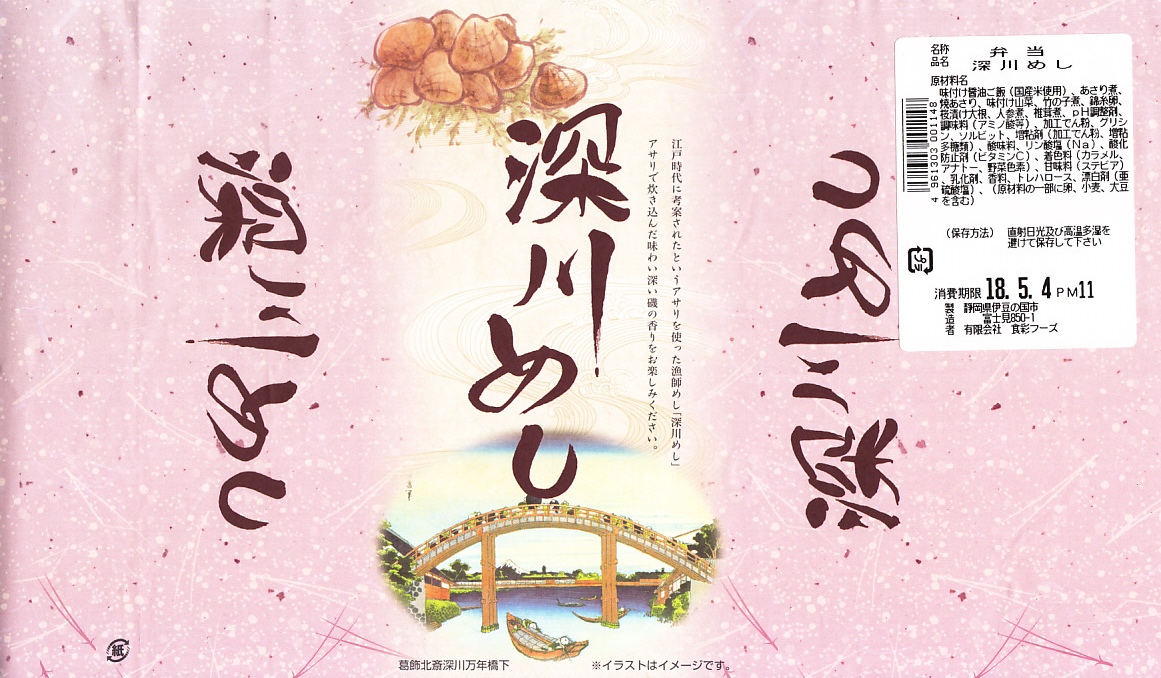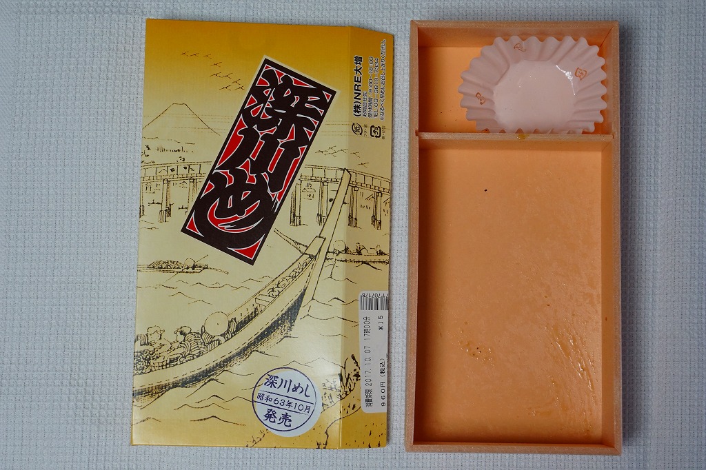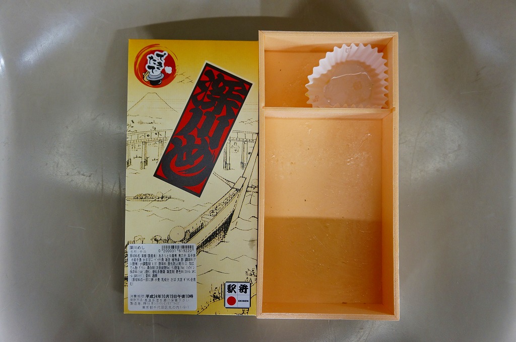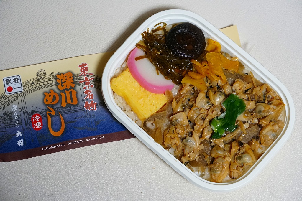 東京駅で買える深川めしのうち、これを1987(昭和62)年に発売した日本食堂の後身でないところが作るもの。駅弁屋や食堂会社でなく、鉄道弘済会売店「キヨスク」の流れをくむ弁当売店「膳まい」で売られる。調製元は東京から遠く伊豆半島の弁当製造業者。