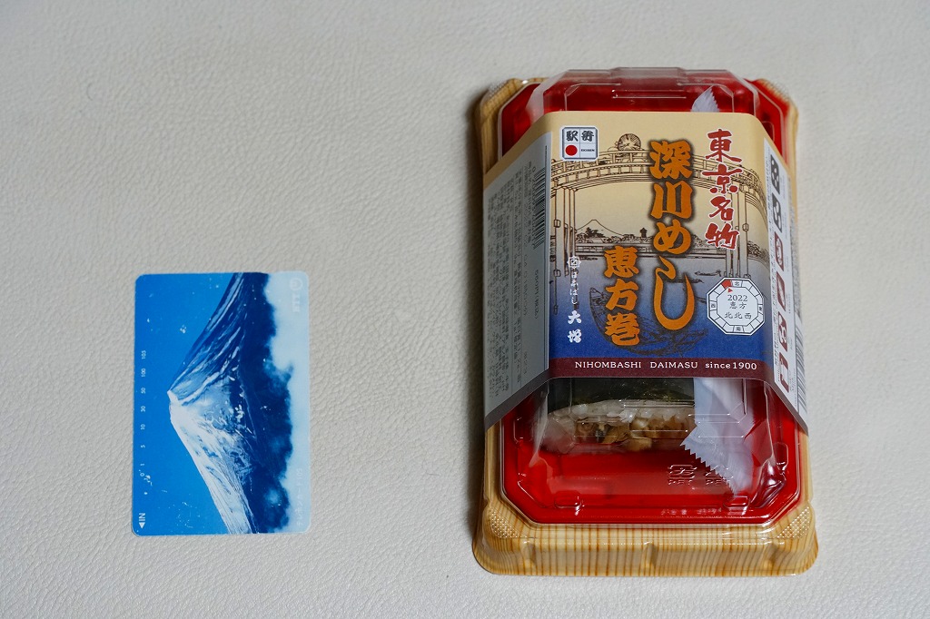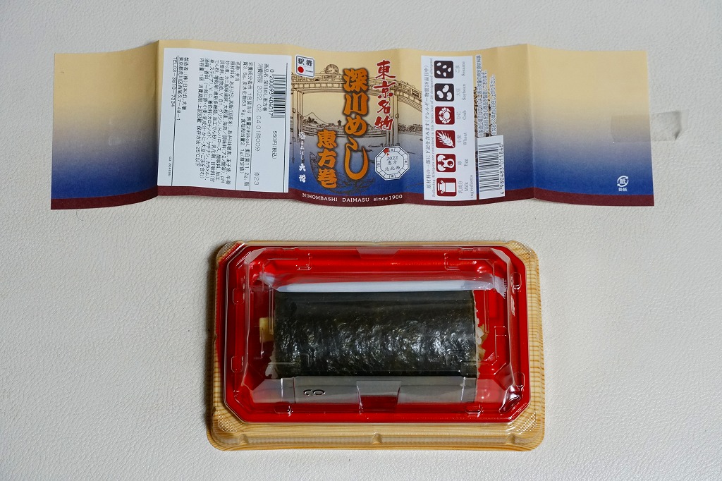2020(令和2)年2月3日に650円で発売、2021年の販売はなく、2022年2月3日にも販売。2000年代に節分での販売が定着し、駅弁でも各地で出ている恵方巻きについて、東京駅の名物駅弁「深川めし」のものが作られた。あさりだし茶飯、あさり味噌煮、玉子焼、ごぼう煮、かに風味かまぼこを海苔で巻いた、小柄な太巻きを1本、プラ製トレーに収め、掛紙を巻く。掛紙の絵柄と具材が、現行の駅弁から取り入れられている。2020年のアナゴ煮と海苔で半分ずつ巻く姿が、今回は普通の海苔巻きとなった。