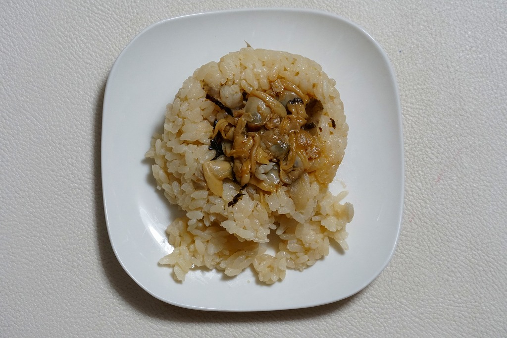 これは東京駅弁の日本ばし大増が監修し、埼玉県のJR東日本クロスステーションが製造し、駅のコンビニで販売する、自社完結の企画商品。駅弁の深川めしのふたと同じ絵柄の袋に、アサリの深川煮とごぼうの炒り煮を具としたアサリ風味御飯のおにぎりを詰める。油で崩壊し食べにくくも、油の風味を含めた駅弁の御飯の味が詰まっていた。