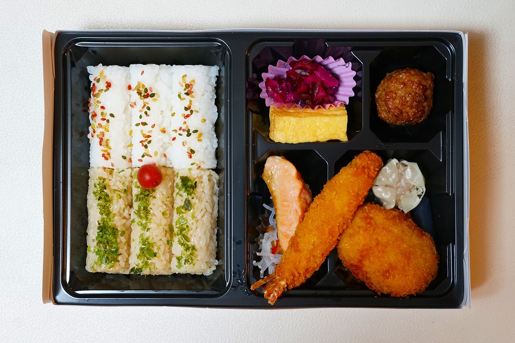 2020(令和2)年3月14日に、「一流料理人が作るバリュー弁当」の触れ込みで、「海苔弁当」「焼肉弁当」「ハンバーグ弁当」とこの「幕の内弁当」の4種類が、赤いパッケージと940円で発売されたもの。これは「神田明神下・雅 総料理長一押し」なのだとか。白飯と白ごま、茶飯と青のりの、細長い日の丸御飯に、野菜コロッケ、エビフライ、焼売、肉団子、玉子焼、焼鮭、春雨、柴漬けを添える。ハンバーグ弁当以外の調製元は同じで、中身もだいたい同じの幕の内風弁当。2021年で終売か。