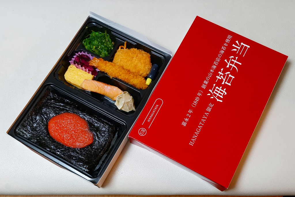 2020(令和2)年3月14日に、「一流料理人が作るバリュー弁当」の触れ込みで、「幕の内弁当」「焼肉弁当」「ハンバーグ弁当」とこの「海苔弁当」の4種類が、赤いパッケージと940円で発売されたもの。これは「寛永2年(1849年)創業の山本海苔店の海苔を使用」なのだとか。海苔で覆って明太子を流した白飯に、野菜コロッケ、エビフライ、スパゲティ、焼売、玉子焼、焼鮭、ごまわかめ、柴漬けを添える。ハンバーグ弁当以外の調製元は同じで、中身もだいたい同じの幕の内風弁当。2021年で終売か。
