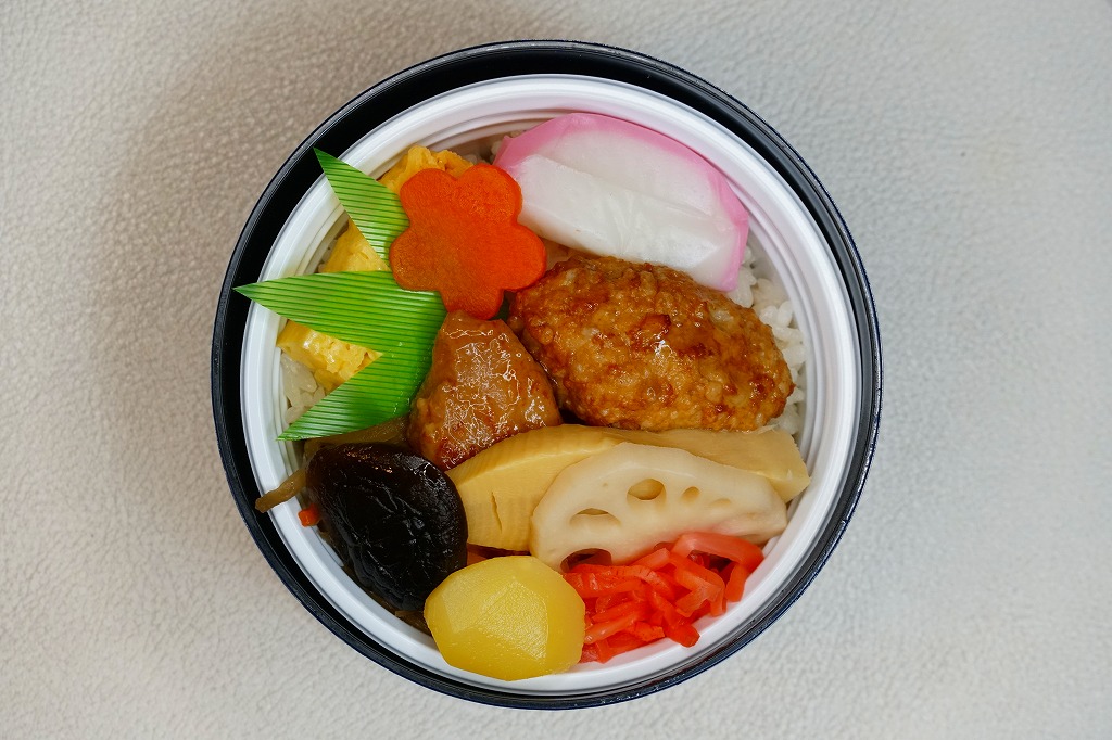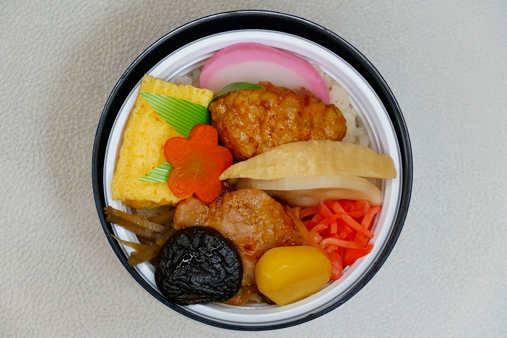 これは「はくつる」で、かつて上野駅と青森駅を東北本線経由で結んだ寝台特急列車「はくつる」のヘッドマークが、丸いプラ容器に描かれる。この容器に直でなくプラ製カップに茶飯を詰め、鶏つくね、鶏照焼、玉子焼、かまぼこ、きんぴらごぼう、くり、タケノコ、しいたけ、れんこん、にんじん、紅生姜を折り重ねる。この内容にも、味わいを見いだせなかった。3月末までの販売か。