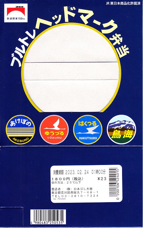 2023(令和5)年2月16日に、スリーブと中身と値段が同じ「あけぼの」「ゆうづる」「はくつる」「鳥海」の4種類が突然に登場。販売元のJR東日本クロスステーションのツイッターは「鉄道開業150周年の最後を飾り、2月16日(木)数量限定発売」としたが、告知も時期も弁当の現物も、やっつけ仕事か突貫作業を感じる。東京駅の駅弁売店「駅弁屋 祭」「駅弁屋 踊」に加えて、大宮駅「駅弁屋旨囲門」と鉄道博物館でも販売したそうな。