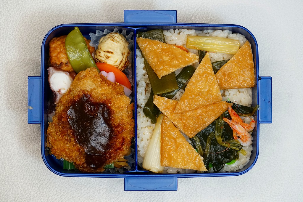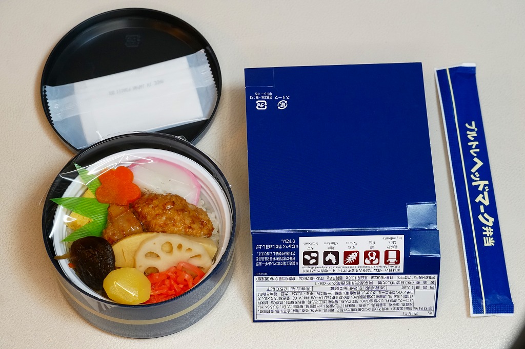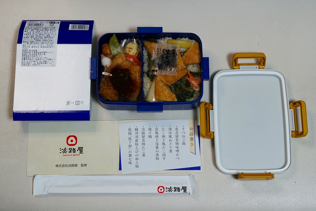 今回の中身は「沿線の名物をイメージした献立を彩り豊かに盛り込みました。」といい、東京の深川風あさり煮、愛知の名古屋名物味噌かつ、京都のきつねご飯と京風焼き湯葉の煮物、大阪のたこ焼き風たこ団子など。神戸で駅弁になった油揚げ御飯の、いなりずしとはひと味違う柔らかな口当たりと水気の豊かさが印象的。調製元は神戸駅弁の淡路屋で、しかし神戸でなく東京都足立区に設けた東京工場での調製。7月には終売か。