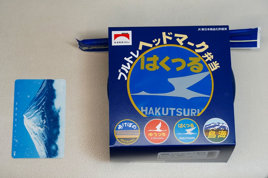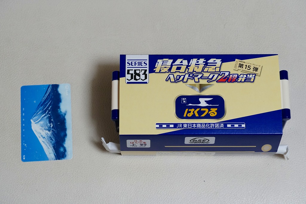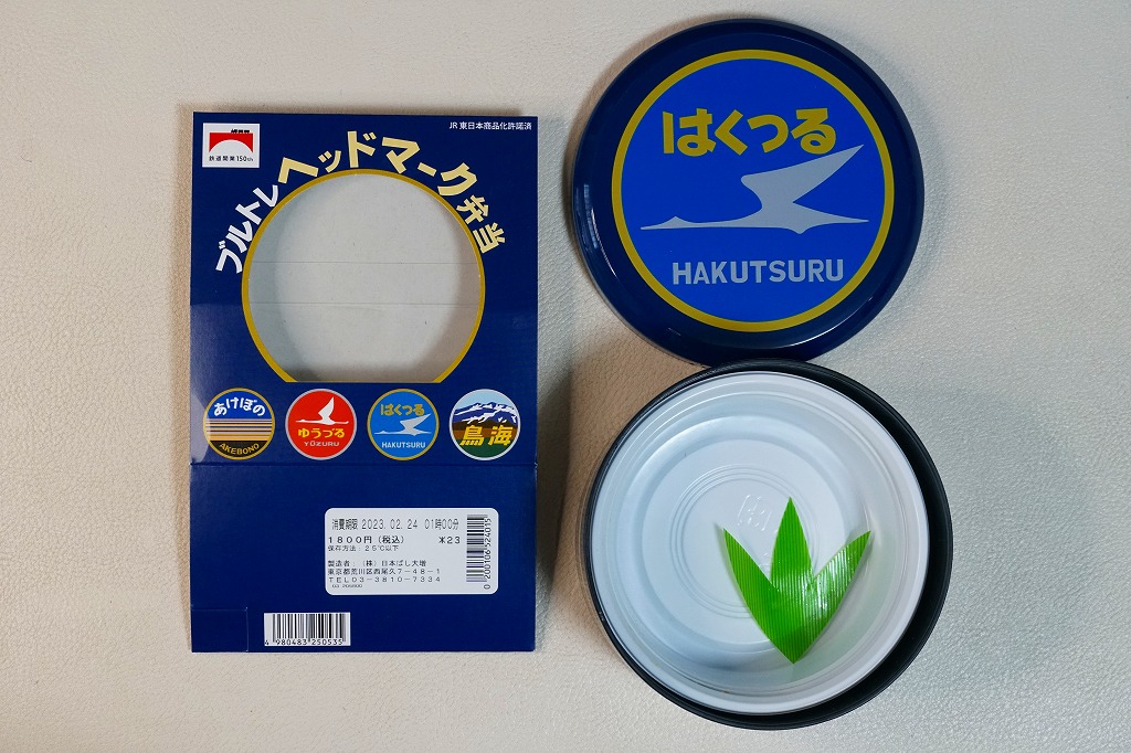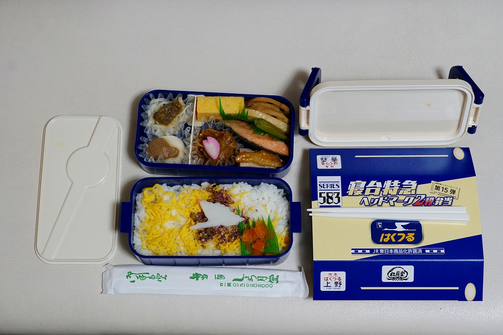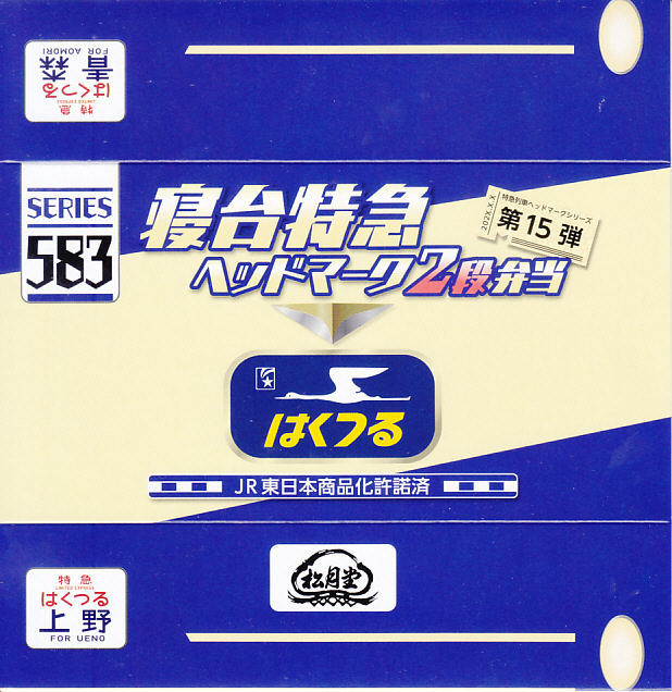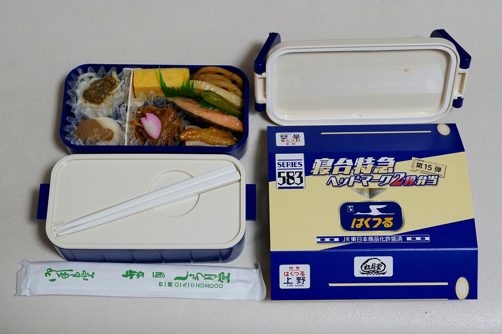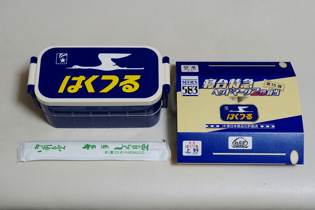 2022(令和4)年3月25日にJR東日本クロスステーションが、東京、上野、蒲田、大宮の各駅の弁当売店「HANAGATAYA」などで発売した、特急列車ヘッドマーク弁当の第15弾。前回の第14弾「みちのく」に引き続き、二段重ねのプラ容器、スケーター株式会社の「ロック式2段ランチボックス」に、今回は寝台特急はくつるのヘッドマークをプリントした。