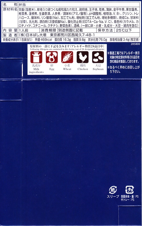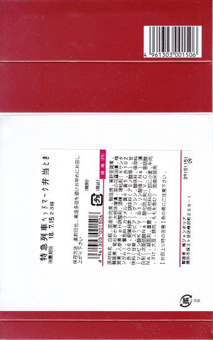 ところでこの駅弁、スリーブには千葉県の安房鴨川駅の駅弁屋「南総軒」の文字があるものの、調製元は遠く広島県の福山駅の駅弁屋「浜吉」となっている。このシリーズは駅弁屋そのものが調製しない商品が過去に何度か出ているものの、今回はどうしてこうなったのか、わけがわからない。