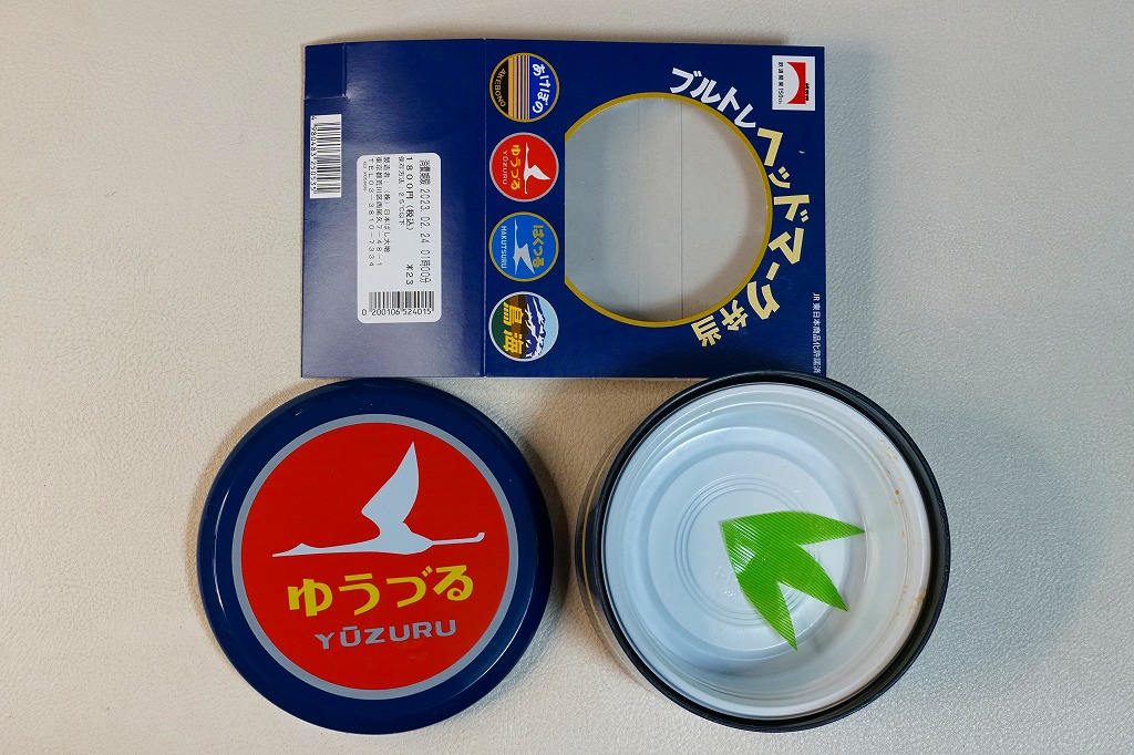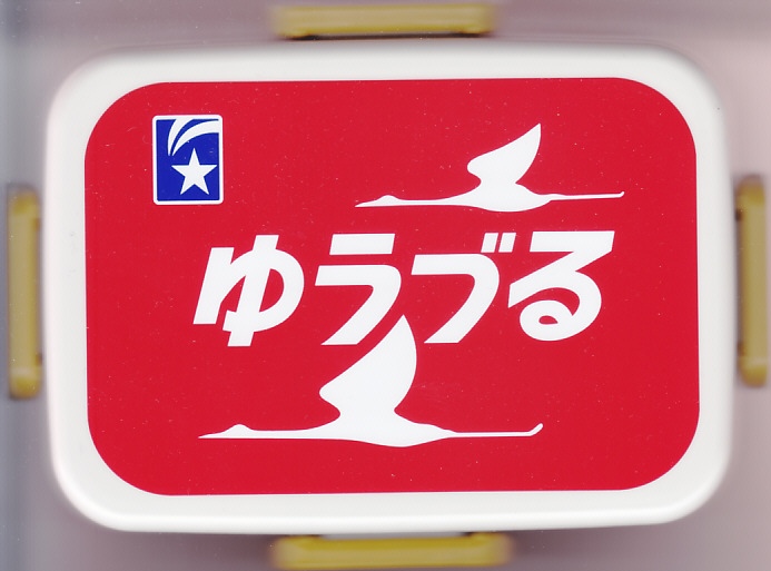 2023(令和5)年2月16日に、スリーブと中身と値段が同じ「あけぼの」「ゆうづる」「はくつる」「鳥海」の4種類が突然に登場。これは「ゆうづる」で、かつて上野駅と青森駅を常磐線経由で結んだ寝台特急列車「ゆうづる」のヘッドマークが、丸いプラ容器に描かれる。それ以外は上記の「はくつる」と同じ。中身が同じでは芸がない、というのは、4種全部を買いたがるマニアの戯言。