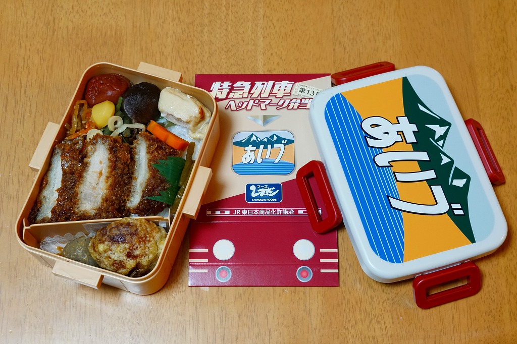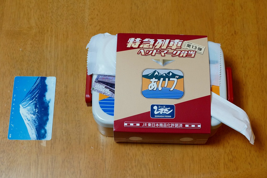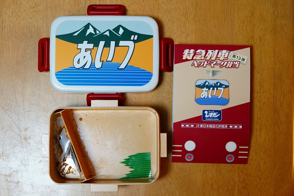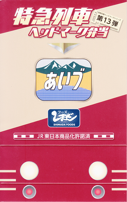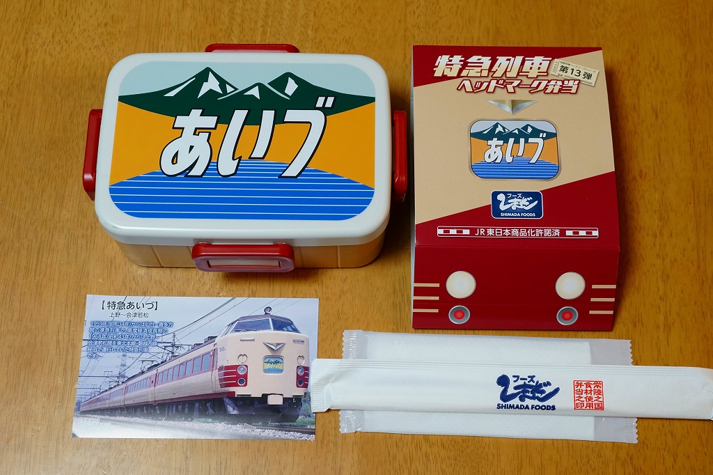 2020(令和2)年10月14日にJR東日本リテールネットが、東京駅の弁当売店「HANAGATAYA」と品川、上野、大宮、蒲田の各駅の弁当売店「膳まい」で発売した、特急列車ヘッドマーク弁当の第13弾。前回の「いなほ」から1年空いたと思ったら、3月14日発売の「ゆうづる」を見逃していた。今回は1968(昭和43)年から上野駅と会津若松駅を結び始めた在来線特急列車「あいづ」のヘッドマークの絵柄を、弁当箱の上面に印刷した。