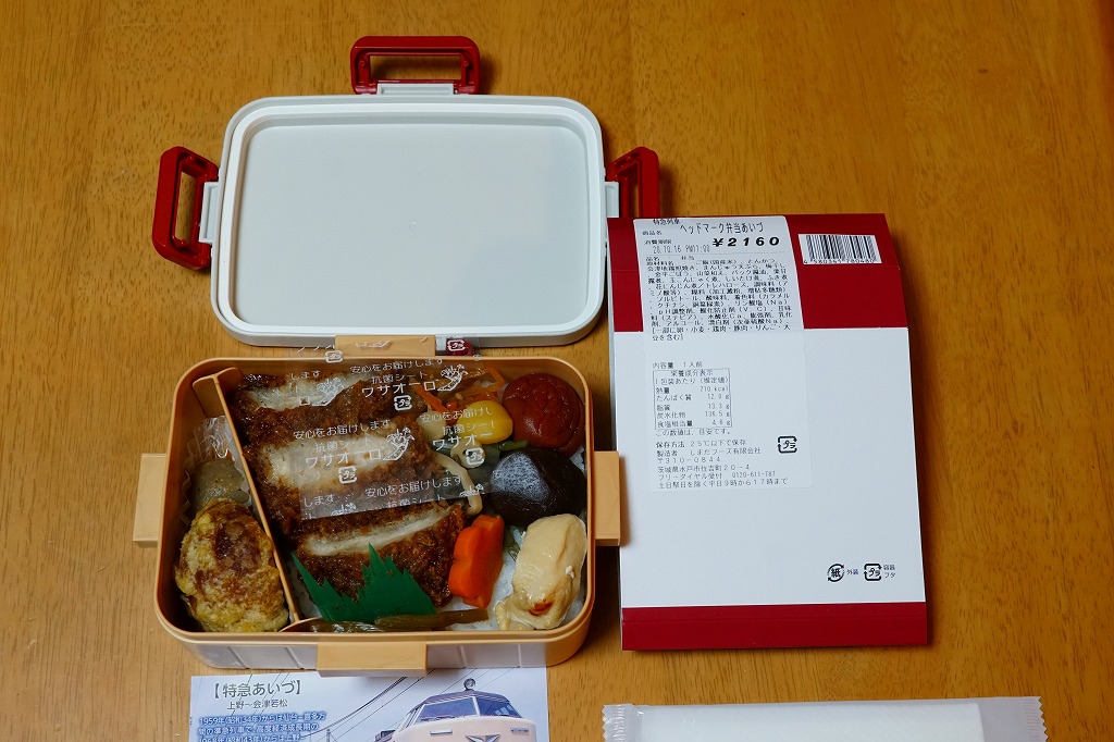 今回の中身は、福島県産コシヒカリの白飯を、ソースカツ、山菜、きんぴら、梅干し、椎茸、会津地鶏の照焼きで覆い、まんじゅうの天ぷらと味噌田楽を添えた。中身は福島なのに、なぜか調製元は福島とも「あいづ」の運転区間とも関係のない、茨城県は水戸駅弁のしまだフーズ。沿線で作ったり監修してくれる駅弁屋は、なかったのだろうか。福島や会津の名物で、古くは福島駅の駅弁にもなっていたソースカツ丼ではない、トンカツ弁当。まんじゅうの天ぷらを除き、普通に食べられる。半年間ほどの販売か。