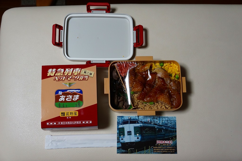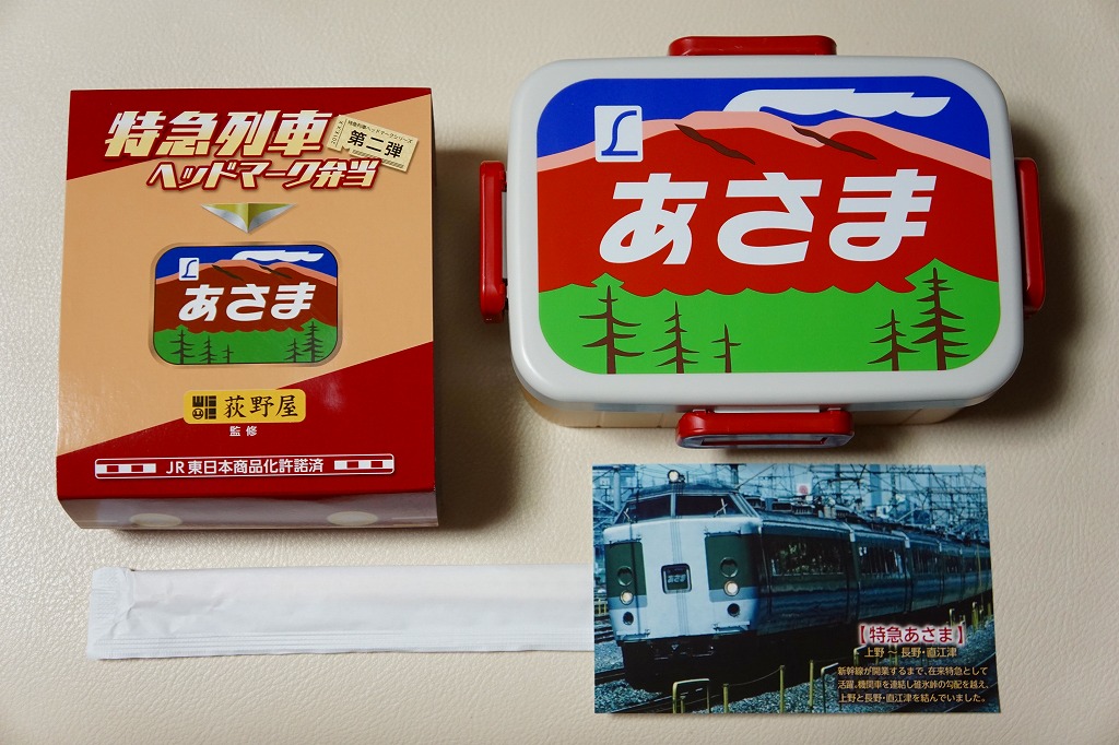 2017(平成29)年8月19日にJR東日本リテールネットが、東京、品川、上野、大宮、蒲田の各駅の弁当売店「膳まい」で発売した、特急列車ヘッドマーク弁当の第2弾。1997(平成9)年まで上野駅と長野駅などを結んだ特急列車「あさま」のヘッドマークの絵柄を、弁当箱の上面に印刷した。