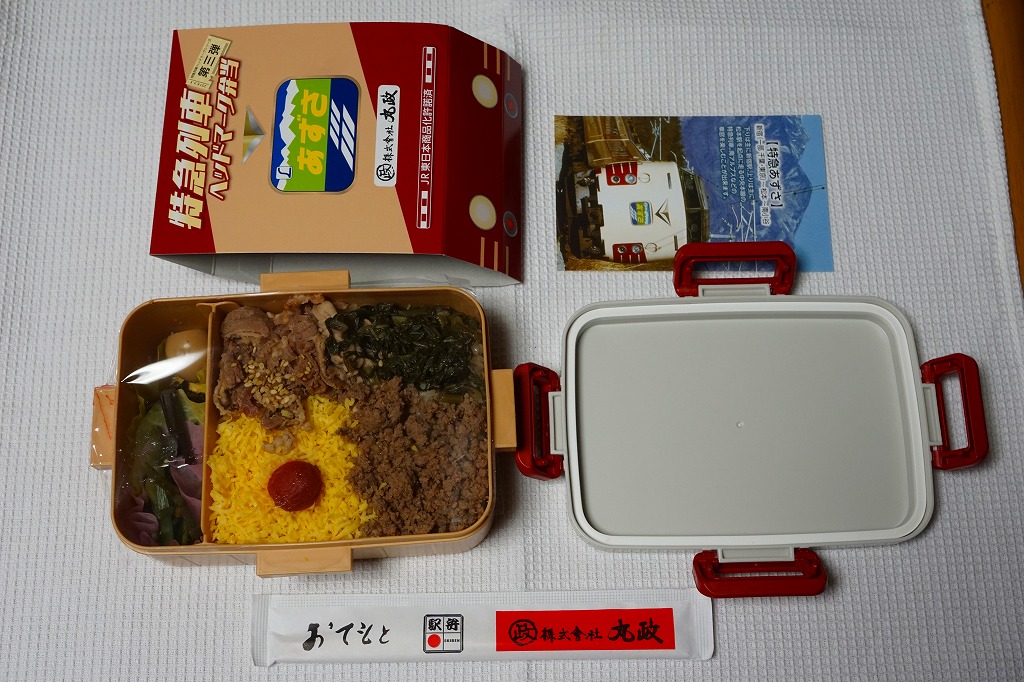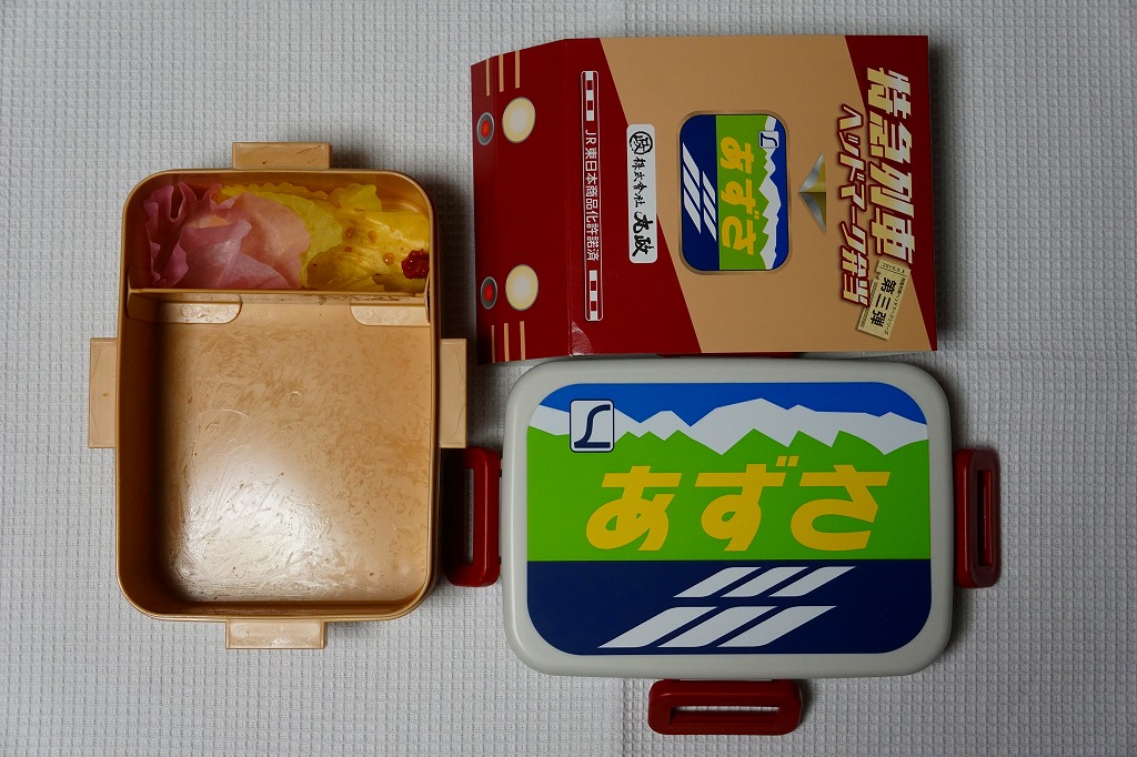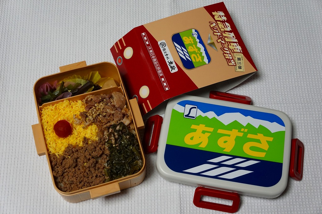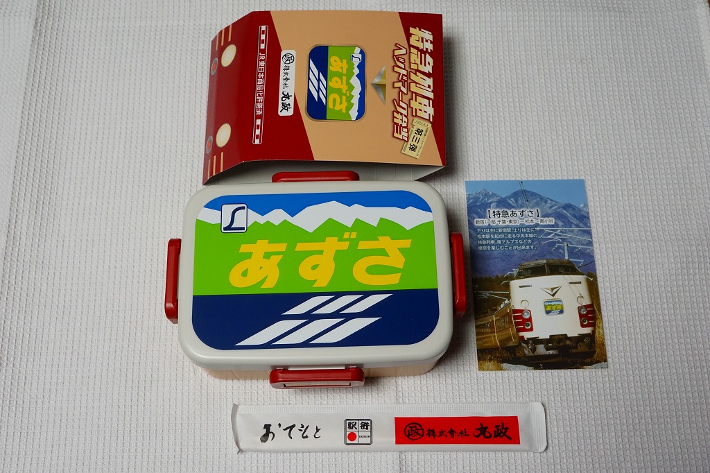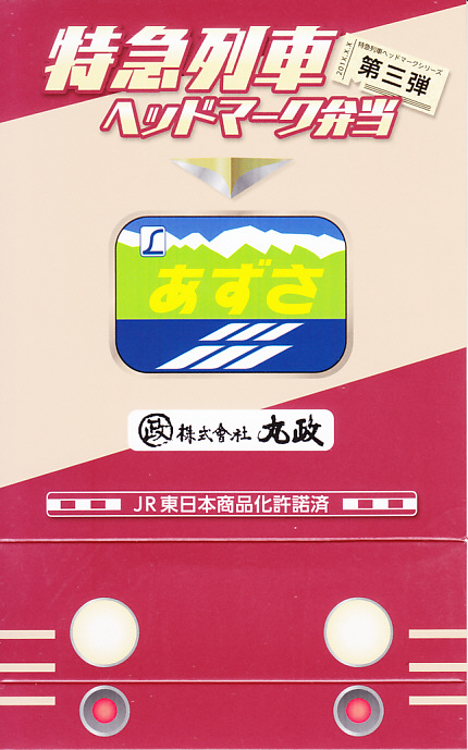 2017(平成29)年12月15日にJR東日本リテールネットが、東京、品川、上野、大宮、蒲田の各駅の弁当売店「膳まい」と甲府駅で発売した、特急列車ヘッドマーク弁当の第3弾。新宿駅などと松本駅などを結ぶ特急列車「あずさ」で、2002(平成14)年に定期列車ではみられなくなったヘッドマークの絵柄を、弁当箱の上面に印刷した。
