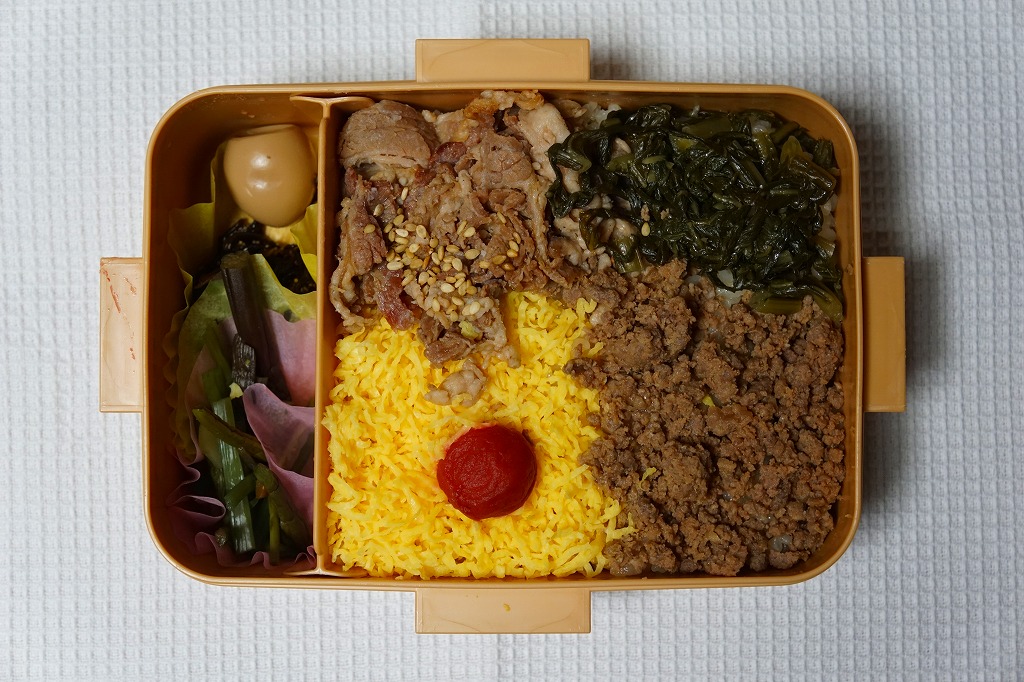 今回の中身は「牛肉どまん中」とされ、その調製元である山形県の米沢駅の駅弁屋が調製。白飯を牛そぼろ、きんぴらごぼう、鶏照焼で覆い、パセリで彩り、いも煮と漬物を添える。「牛肉どまん中」には、そんなに似ていない。