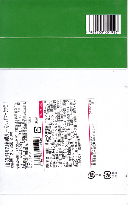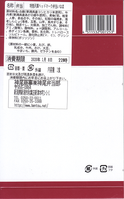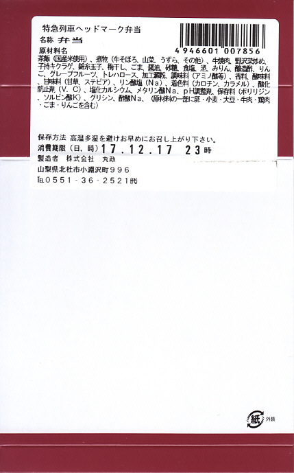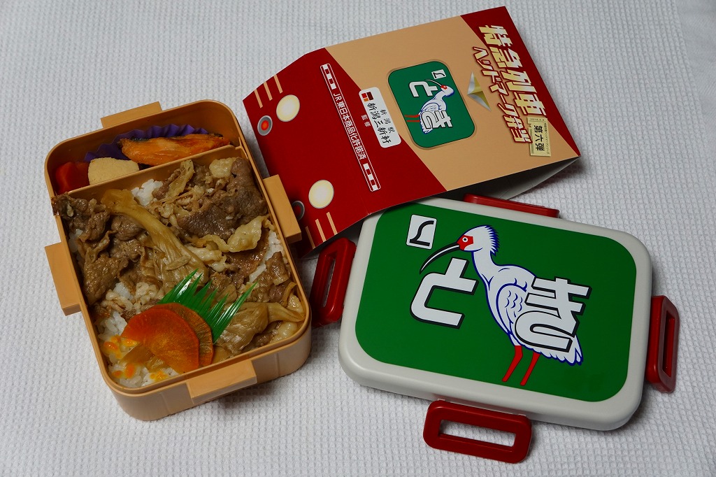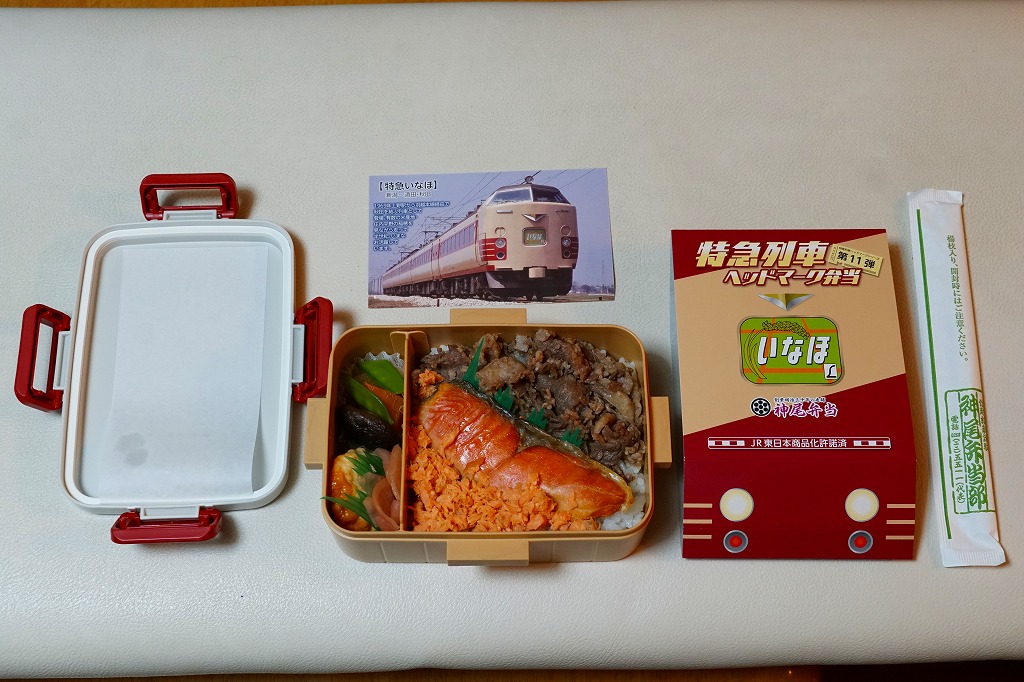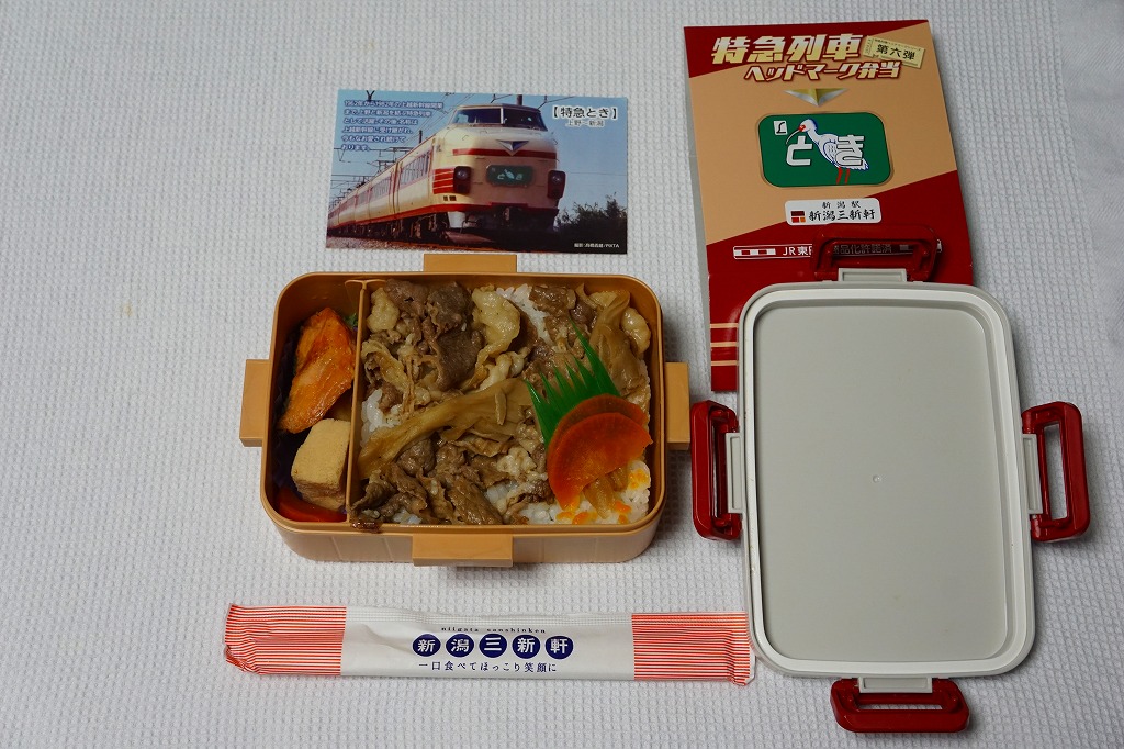 今回の中身は牛めしで、新潟駅の駅弁屋が監修。白飯を牛肉煮で覆い、マイタケとタクアンを載せ、焼鮭と煮物と菜の花を添える。新潟駅にこんな牛肉駅弁が、あったかどうか。過去の「あずさ」や「ひたち」も牛肉駅弁で、それらとあまり変わらない。箸袋は駅弁屋のものだが、調製元は「北斗星」と同じく、神奈川県横浜市の食品工場となっている。