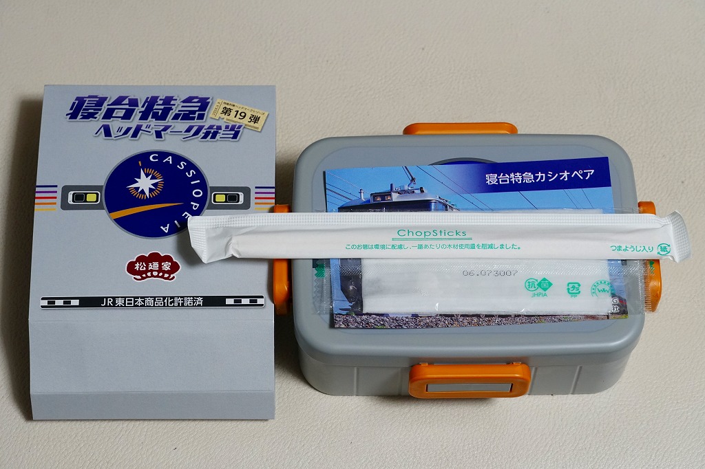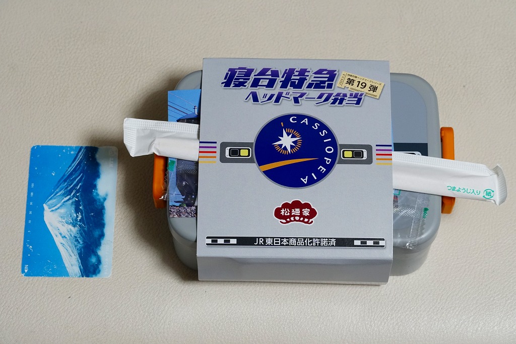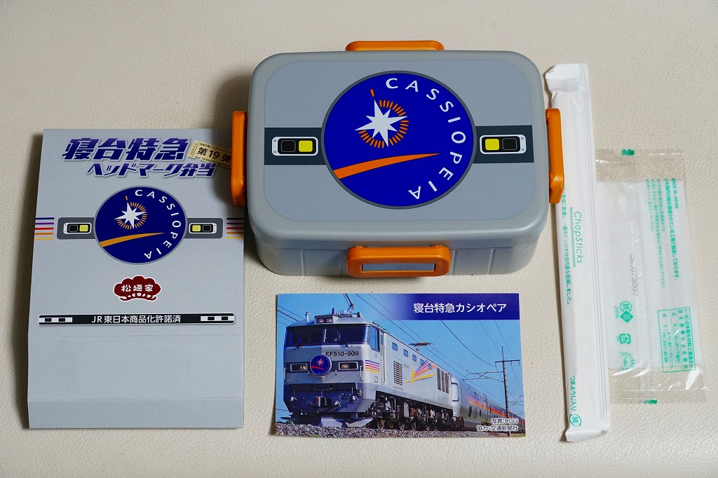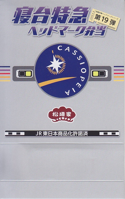 2025(令和7)年7月28日にJR東日本クロスステーションが、東京、上野、蒲田、大宮の各駅の売店「HANAGATAYA」で発売した、特急列車ヘッドマーク弁当シリーズの第19弾。前年10月の「北陸」以来、約9か月ぶりの新作。スケーター株式会社のプラ容器「4点ロックランチボックス」を引き続き使い、2016年3月まで上野駅と札幌駅を結んだ臨時寝台特急列車「カシオペア」のヘッドマークの絵柄を、スリーブと弁当箱の上面に印刷した。