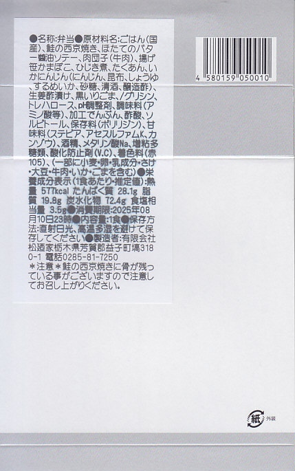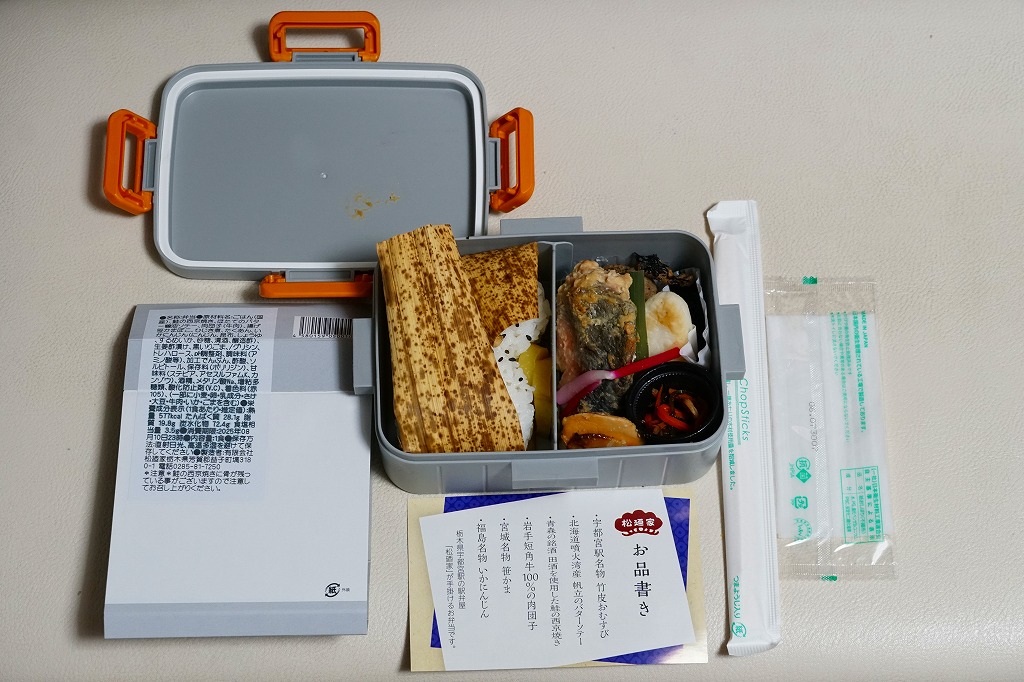中身は、竹皮おむすび、北海道噴火湾産帆立のバターソテー、青森の銘酒「田酒」を使用した鮭の西京焼き、岩手短角牛100%の肉団子、宮城名物笹かまぼこ、福島名物いかにんじん。駅弁発祥宇都宮駅説に基づく竹皮に包んだ2個のおむすびを含め、中身のそれぞれが列車運転区間の沿線の地名に結び付けられた。調製元は宇都宮駅弁の松廼家。8月31日まで販売。