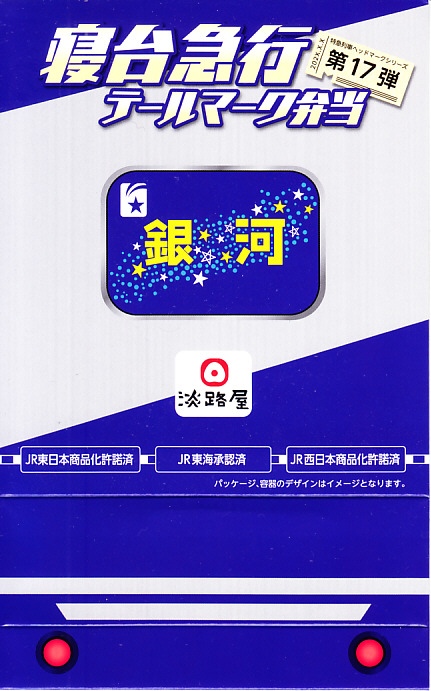 2023(令和5)年6月1日にJR東日本クロスステーションが、東京、上野、蒲田、大宮の各駅の売店「HANAGATAYA」で発売した、特急列車ヘッドマーク弁当シリーズの第17弾。前年7月の「やまびこ」以来、10か月半ぶりの新作。今回は価格を170円上げ、スケーター株式会社のプラ容器「4点ロックランチボックス」を引き続き使い、2008年3月まで東京駅と大阪駅などを結んだ寝台急行列車「銀河」のテールマークの絵柄を、弁当箱の上面に印刷した。