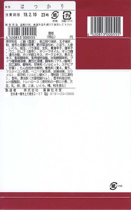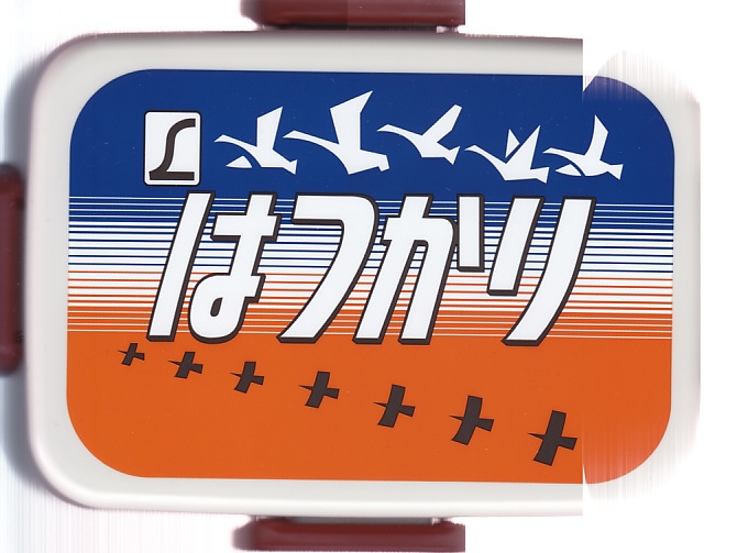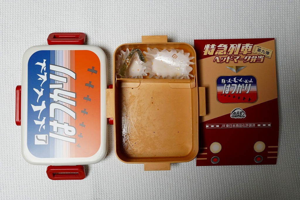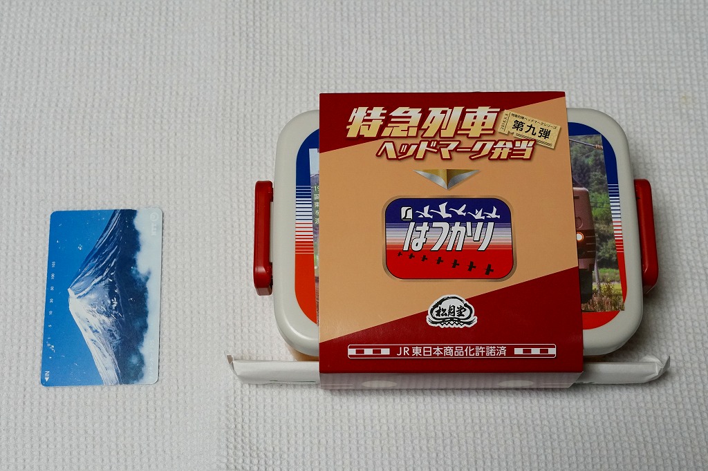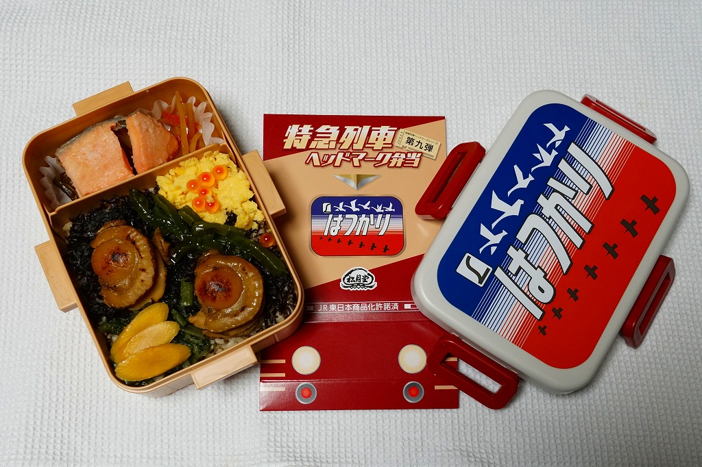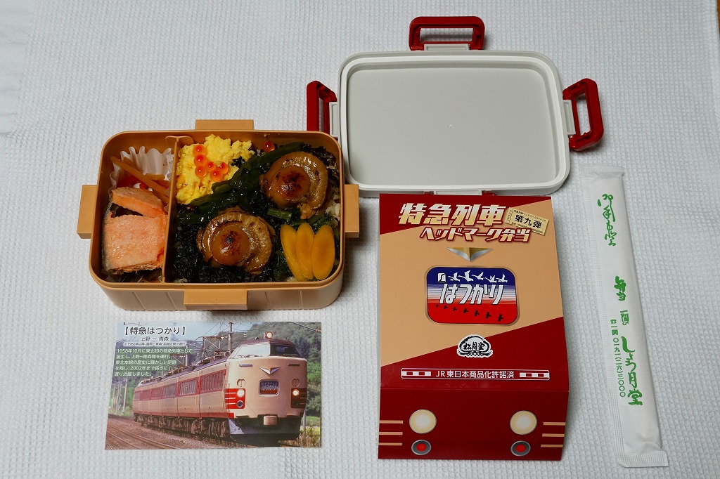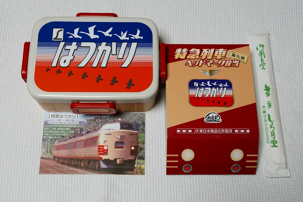 2019(平成31)年2月5日にJR東日本リテールネットが、東京、品川、上野、大宮、蒲田の各駅の弁当売店「膳まい」で発売した、特急列車ヘッドマーク弁当の第9弾。今回はかつて上野駅と青森駅を結んだ在来線特急列車「はつかり」のヘッドマークの絵柄を、弁当箱の上面に印刷した。