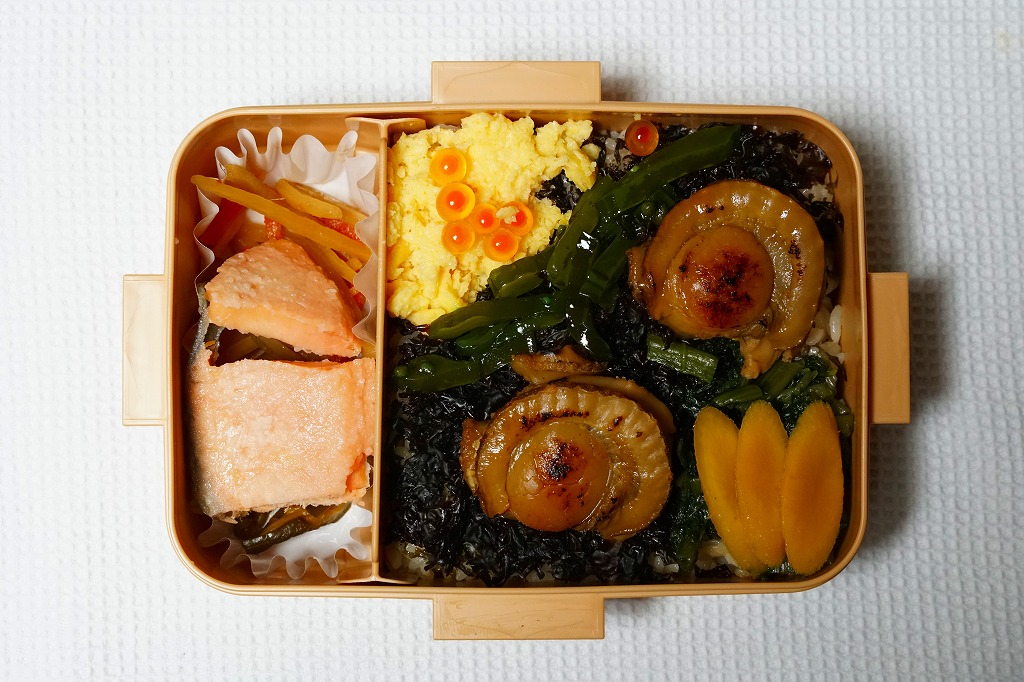 今回の中身は海の幸なのだそうで、岩手県の一ノ関駅の駅弁屋が調製。ウニと昆布の炊込飯を、海苔とワカメと炒り卵で覆い、ホタテ照焼とイクラと山ごぼうを載せ、焼鮭ときんぴらごぼうときゅうり漬を添える。既存の一ノ関駅弁にない感じの内容。