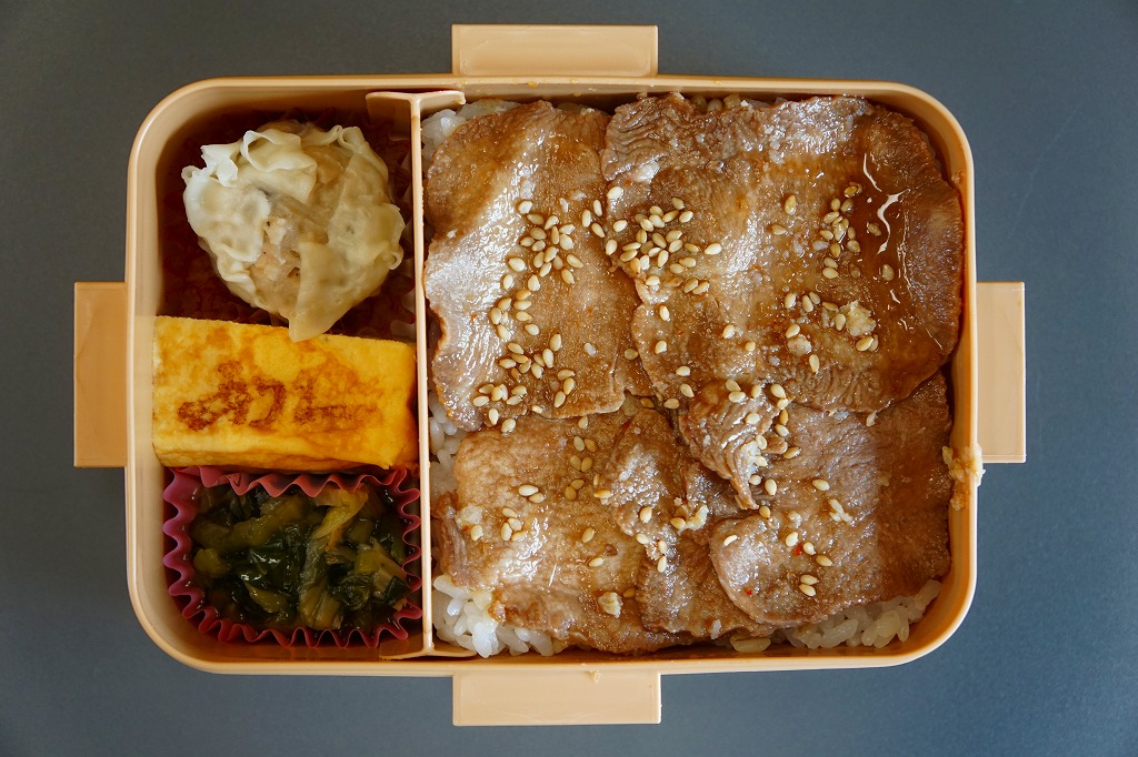 今回の中身は牛たん弁当で、仙台発祥で全国展開する牛たんチェーン店の調製。麦入り白飯を牛たん焼4枚で覆い、牛たん入り焼売、牛たん入り玉子焼、青菜刻み漬けを添えた。小学生サイズのプラ製弁当箱と、米沢駅弁の牛たん弁当のような味と中身で、価格は実に2160円。弁当箱代と駅弁代を重ねて課金された印象。