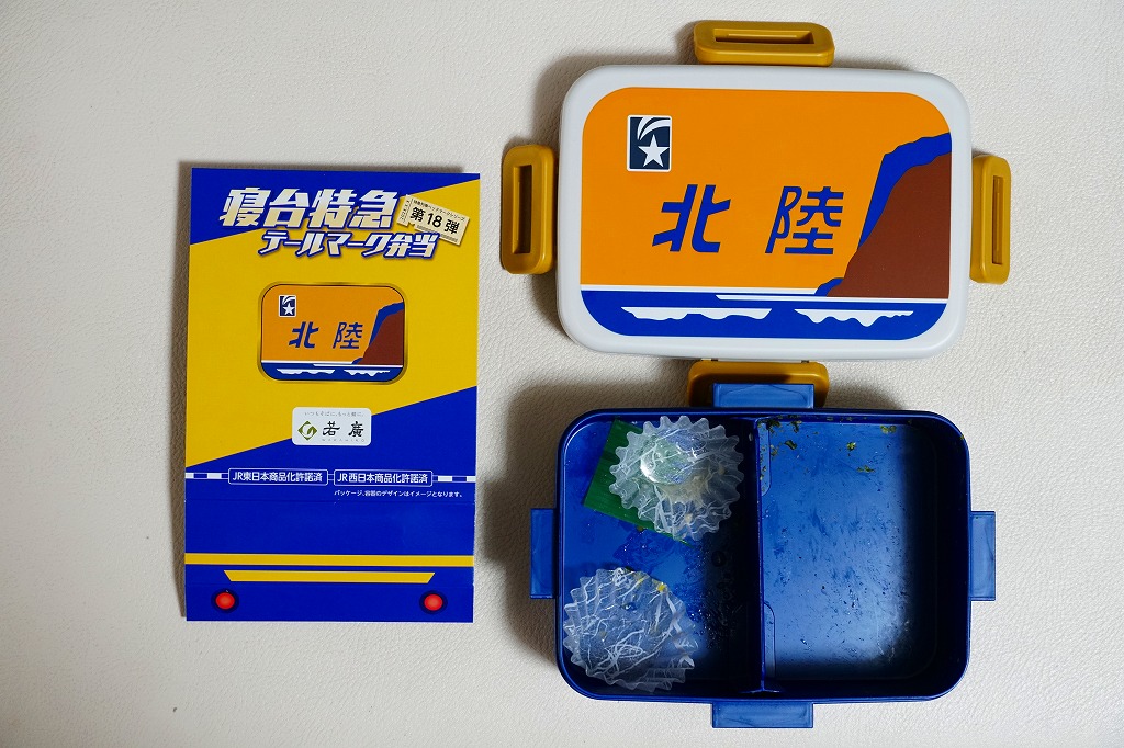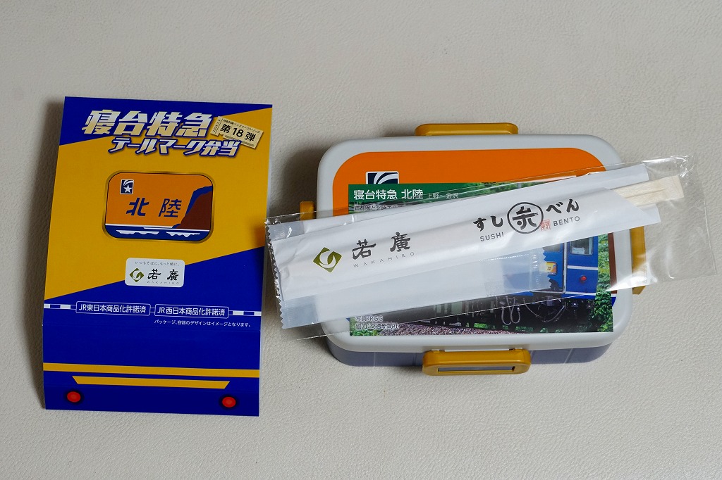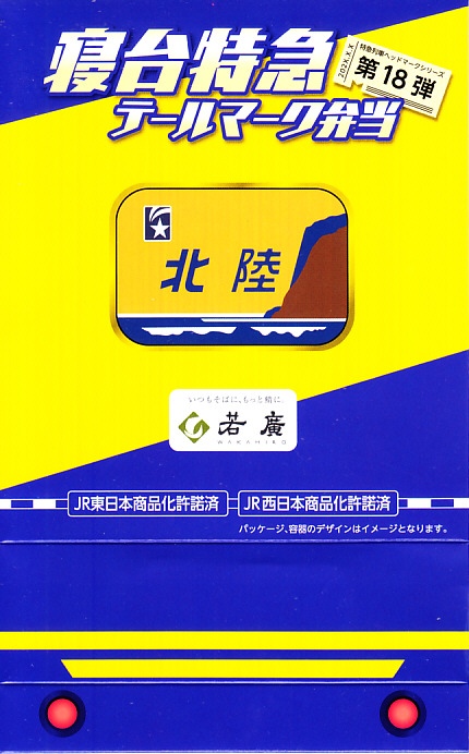 2024(令和6)年10月14日にJR東日本クロスステーションが、東京、上野、蒲田、大宮の各駅の売店「HANAGATAYA」で発売した、特急列車ヘッドマーク弁当シリーズの第18弾。前年6月の「銀河」以来、16か月半ぶりの新作。スケーター株式会社のプラ容器「4点ロックランチボックス」を引き続き使い、2010年3月まで上野駅と金沢駅などを結んだ寝台特急列車「北陸」のテールマークの絵柄を、弁当箱の上面に印刷した。