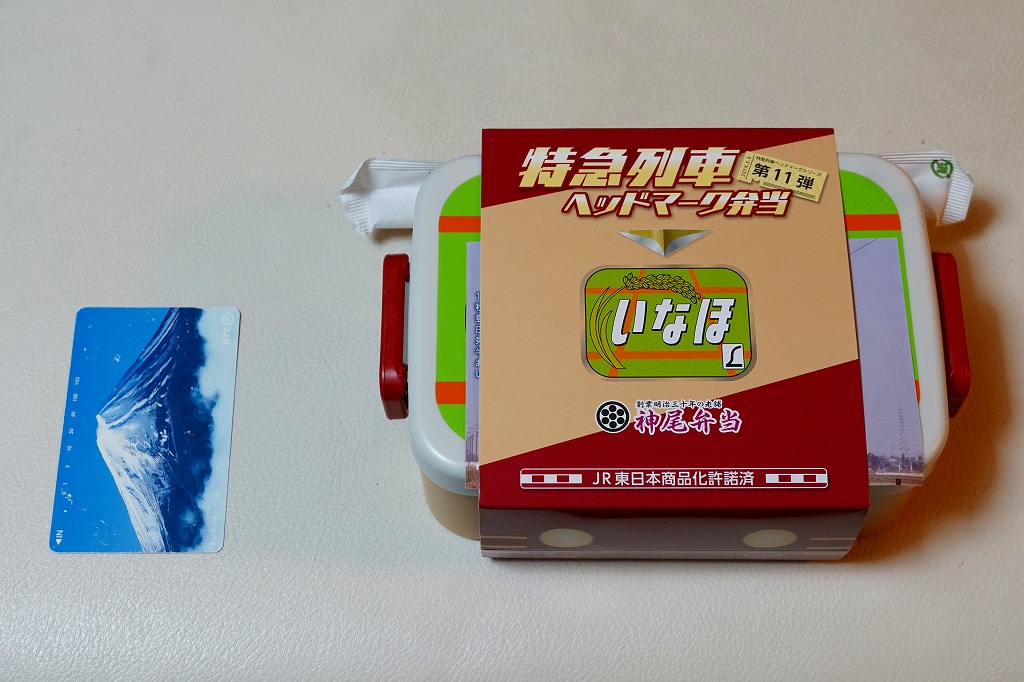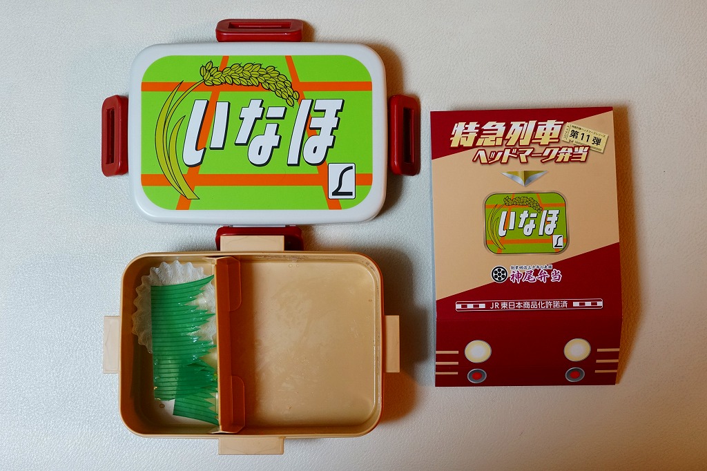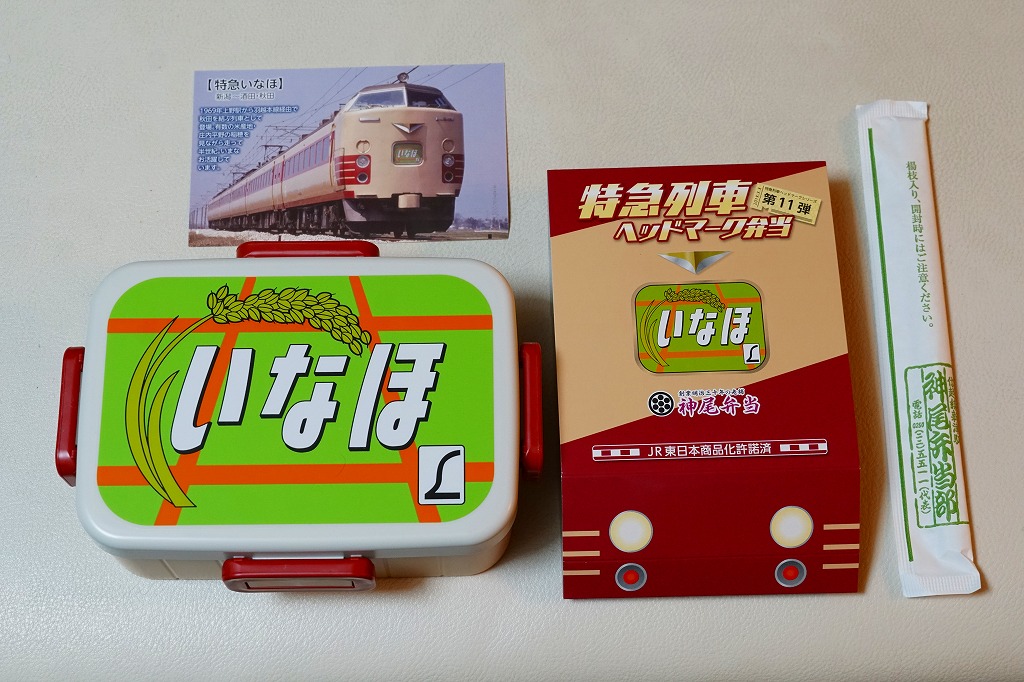 2019(令和元)年10月30日にJR東日本リテールネットが、東京、品川、上野、大宮、蒲田の各駅の弁当売店「膳まい」と新潟駅で発売した、特急列車ヘッドマーク弁当の第11弾。今回は1969(昭和44)年から上野駅と秋田駅を結び始めた在来線特急列車「いなほ」のヘッドマークの絵柄を、弁当箱の上面に印刷した。