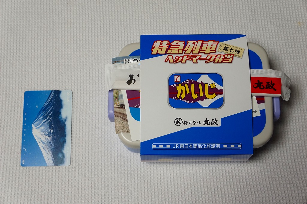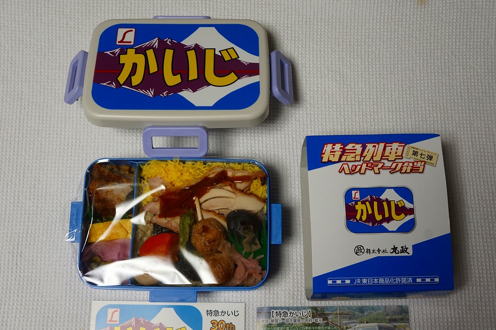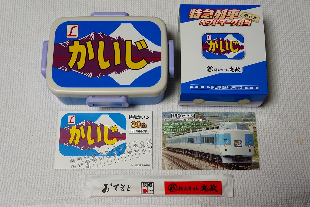 2018(平成30)年9月10日にJR東日本リテールネットが、東京、品川、上野、大宮、蒲田の各駅の弁当売店「膳まい」と新宿駅と八王子駅と甲府駅で発売した、特急列車ヘッドマーク弁当の第7弾。今回は1988(昭和63)年から新宿駅と甲府駅を結ぶ在来線特急列車「かいじ」のヘッドマークの絵柄を、弁当箱の上面に印刷した。