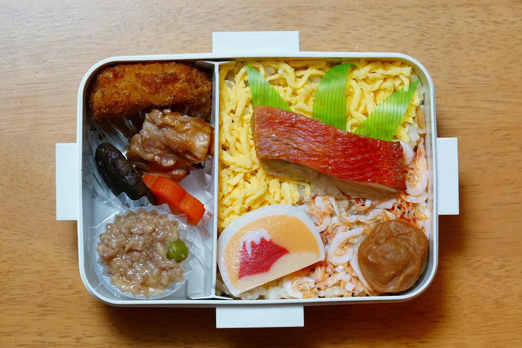 中身はタケノコ御飯を錦糸卵とサクラエビで覆い、梅干しとかまぼこを載せ、コロッケ、鶏照焼、ニンジンとしいたけ、とりそぼろを添える。小田原駅弁の東華軒の駅弁に使われる食材で構成されていることが、駅弁をよく食べる人には分かる。半月ちょっとの販売で、4月には終売か。