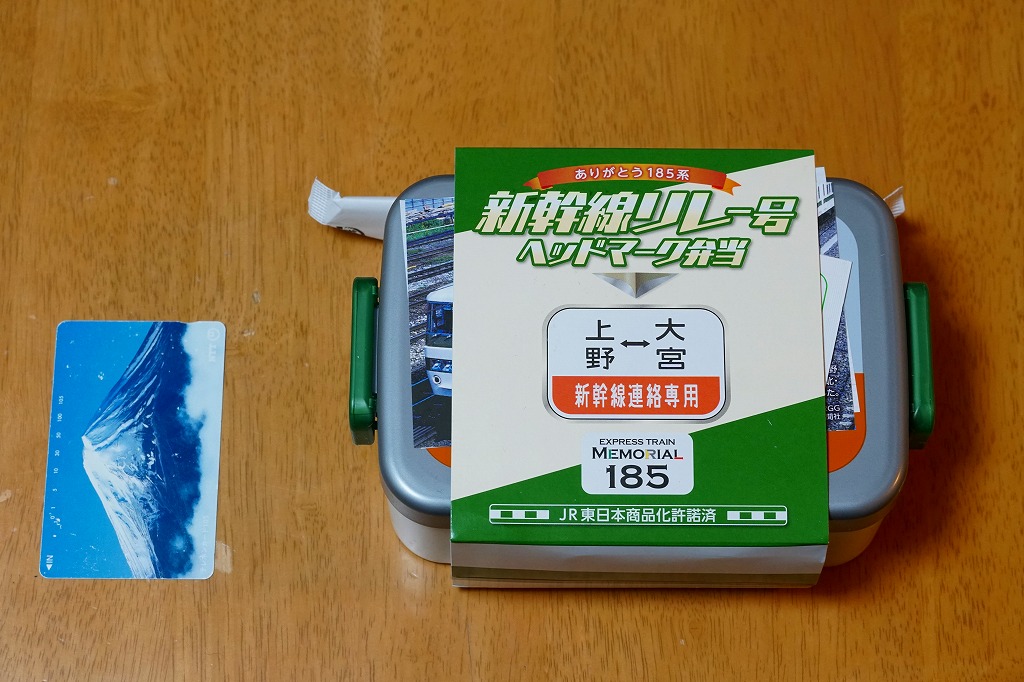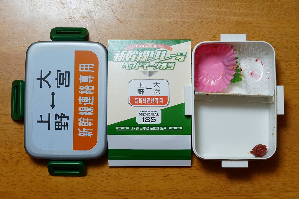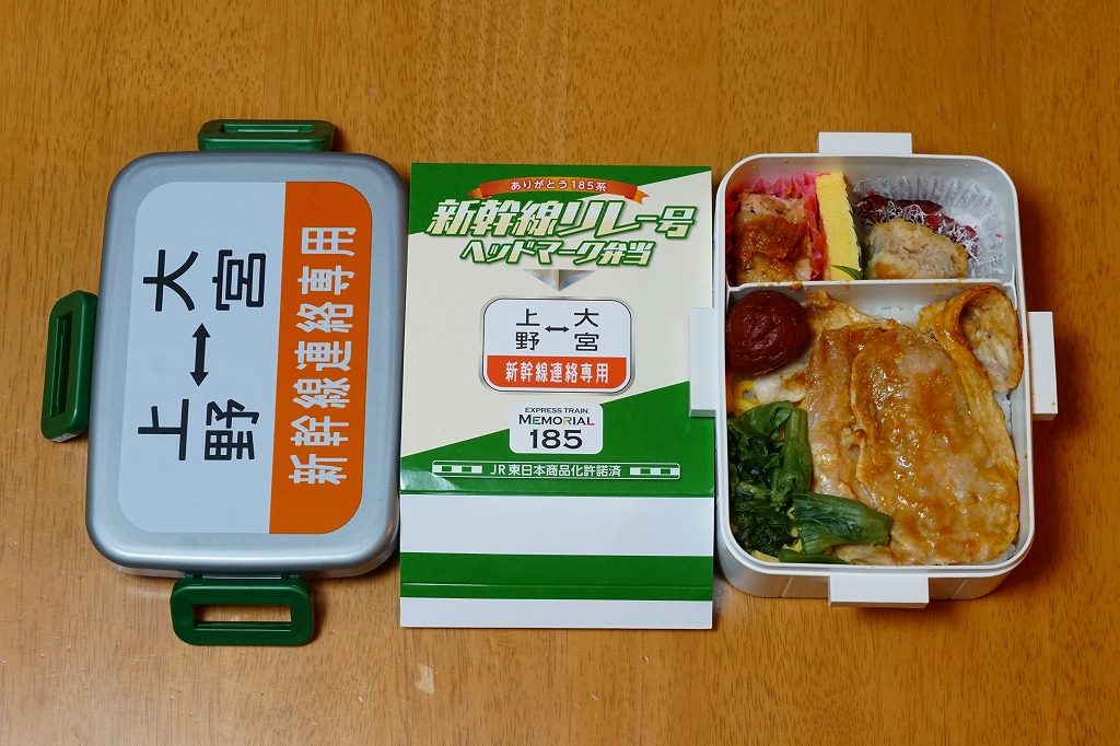 1982(昭和57)年6月の東北新幹線の大宮駅から盛岡駅での暫定開業から、1985(昭和60)年3月の新幹線の上野駅から大宮駅までの延伸開業まで、在来線の上野駅と大宮駅を結んだ列車「新幹線リレー号」のヘッドマークの絵柄を、弁当箱の上面に印刷した。中身は白飯を豚ロース味噌焼で覆い、菜の花と梅干しと錦糸卵を添え、チキンソテーとメンチカツ、玉子焼と漬物を付け合わせるもの。半月ちょっとの販売で、4月には終売か。