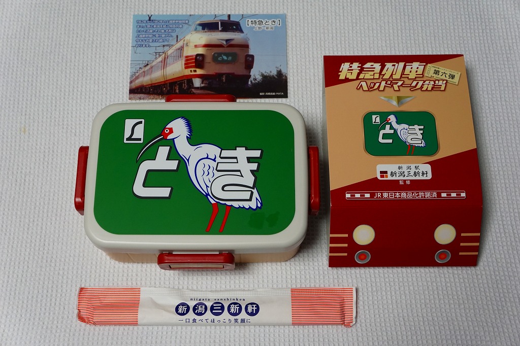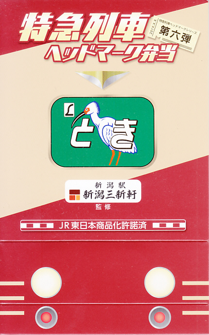 2018(平成30)年7月9日にJR東日本リテールネットが、東京、品川、上野、大宮、蒲田の各駅の弁当売店「膳まい」と新潟駅で発売した、特急列車ヘッドマーク弁当の第6弾。今回は1982(昭和57)年まで上野駅と新潟駅を結んだ在来線特急列車「とき」のヘッドマークの絵柄を、弁当箱の上面に印刷した。