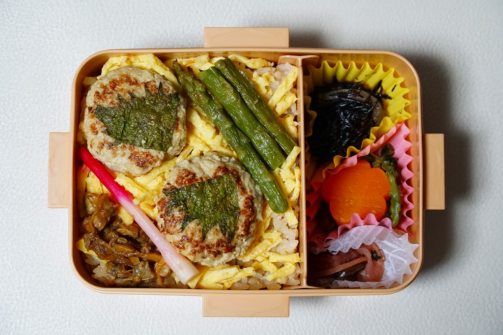 今回の中身は、下段が御飯で岩手県産ひとめぼれの白飯に少量の錦糸卵と刻み梅と大根味噌漬を添え、はくつる型のかまぼこを据えたもの。上段がおかずで盛岡じゃじゃ麺風、一関名物くるみ餅、岩手県産黒毛和牛あぶり焼き、銀鮭塩焼き、岩手県産鶏の照り焼き。調製元は岩手県は一ノ関駅の駅弁屋であり、岩手県の味や食材が詰まる。5月までの販売か。