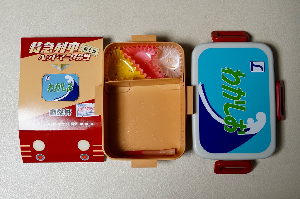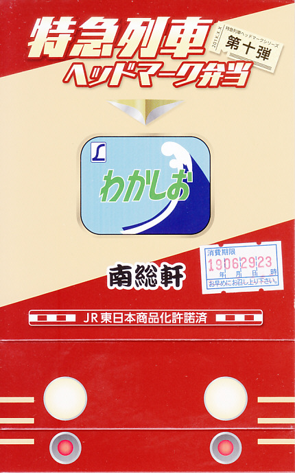 2019(令和元)年6月28日にJR東日本リテールネットが、東京、品川、上野、大宮、蒲田の各駅の弁当売店「膳まい」で発売した、特急列車ヘッドマーク弁当の第10弾。今回は1972(昭和47)年から東京駅と安房鴨川駅などを結ぶ在来線特急列車「わかしお」のヘッドマークの絵柄を、弁当箱の上面に印刷した。