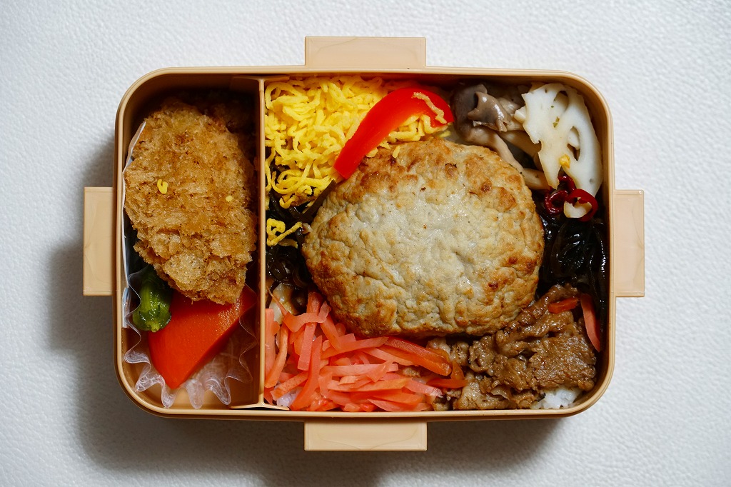 中身は岩手県産ひとめぼれの白飯を、岩手県一関と東京の食品業者のブランド肉「格之進」を使う、ハンバーグと炙り焼きで覆い、蓮根酢漬け、しめじとエリンギのソテー、紅生姜、錦糸卵を添え、煮物と格之進メンチカツを付けたもの。そんな内容は、一ノ関駅の駅弁「岩手一ノ関金格ハンバーグと牛あぶり焼き弁当」(1,280円)と、だいたい同じ。ビーフ100%にこだわらない、常温でおいしいハンバーグ弁当。8月までの販売。