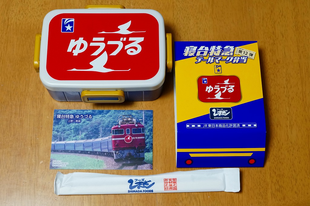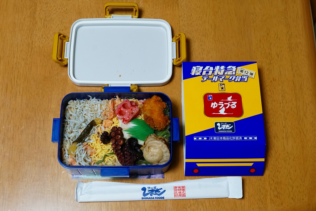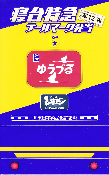 今回は1965(昭和40)年10月から1993(平成5)年11月まで、上野駅と青森駅を常磐線経由で結んだ寝台特急列車「ゆうづる」のテールマークの絵柄を、弁当箱の上面に印刷した。これに伴い表題を「特急列車ヘッドマーク弁当」から「寝台特急テールマーク弁当」に変更したのは、2018年5月発売の第5弾「北斗星」と同じ。調製元は「ゆうづる」廃止後、当時の駅弁屋の全滅後に、水戸駅に進出した駅弁屋。