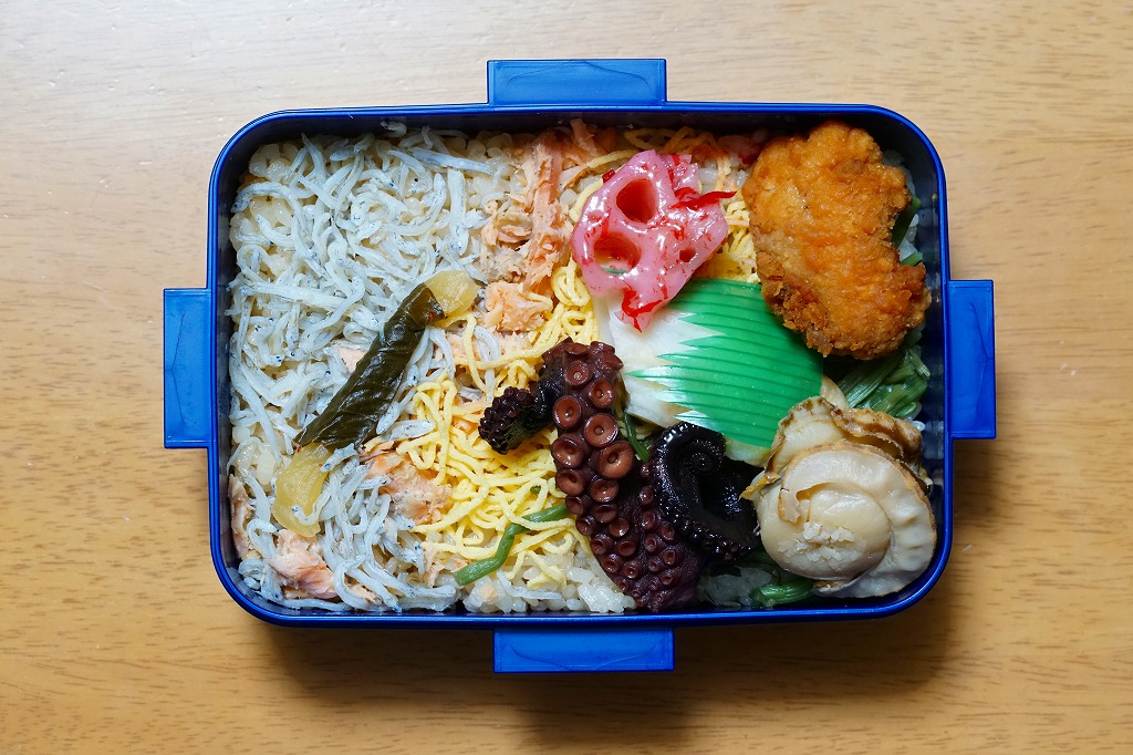 今回の中身は、アサリの炊込飯を、シラスや錦糸卵で覆ったり、タコ甘辛煮、ホタテのバター煮、あんこう唐揚げ、笹かまぼこ、いわき名物の「長久保巻き」、梅れんこん、鮭フレーク、みつばを添えるもの。常磐線の沿線の味を詰めてくれたのに、食感はなんとなく、地味で平板。
