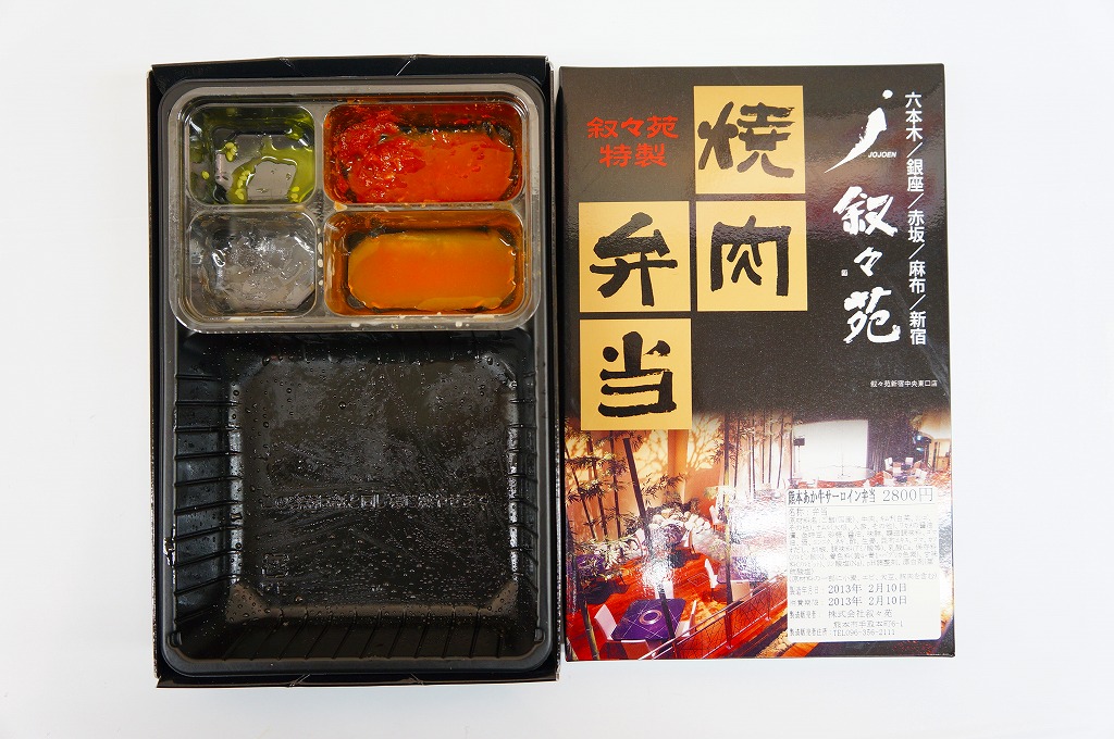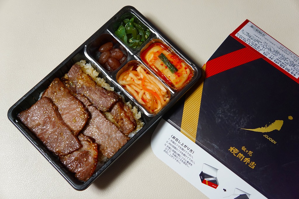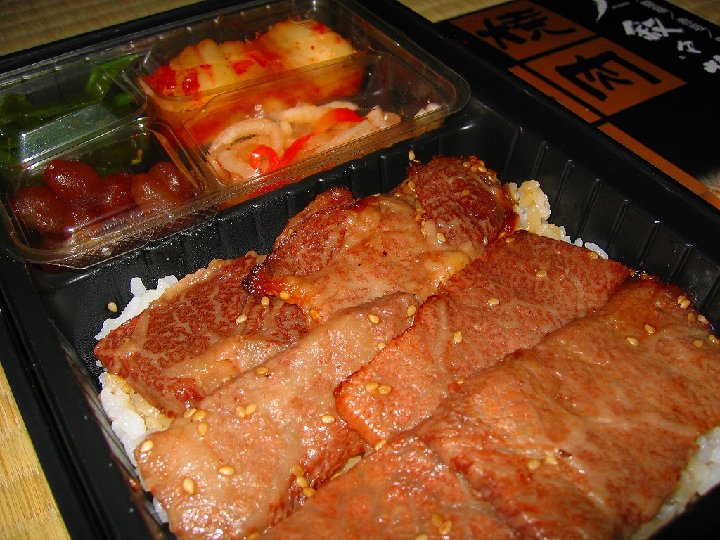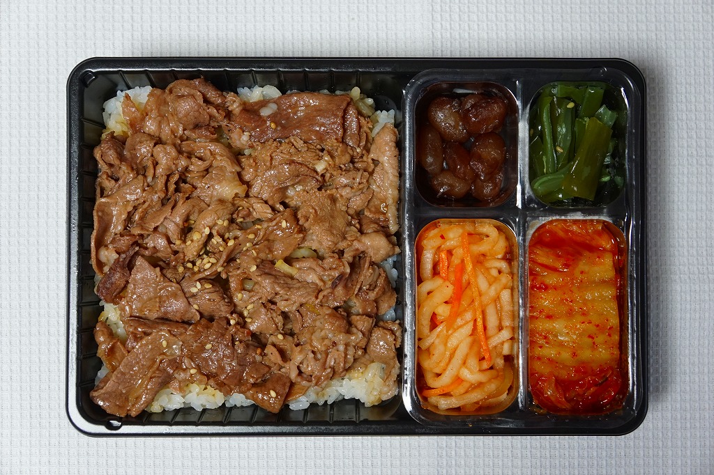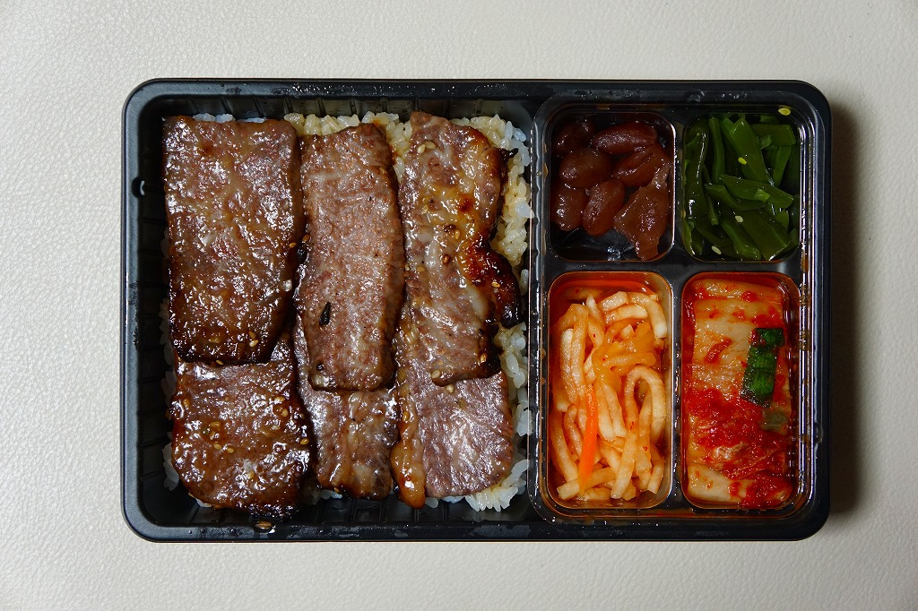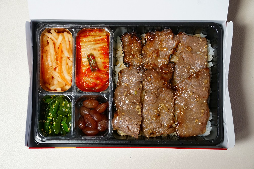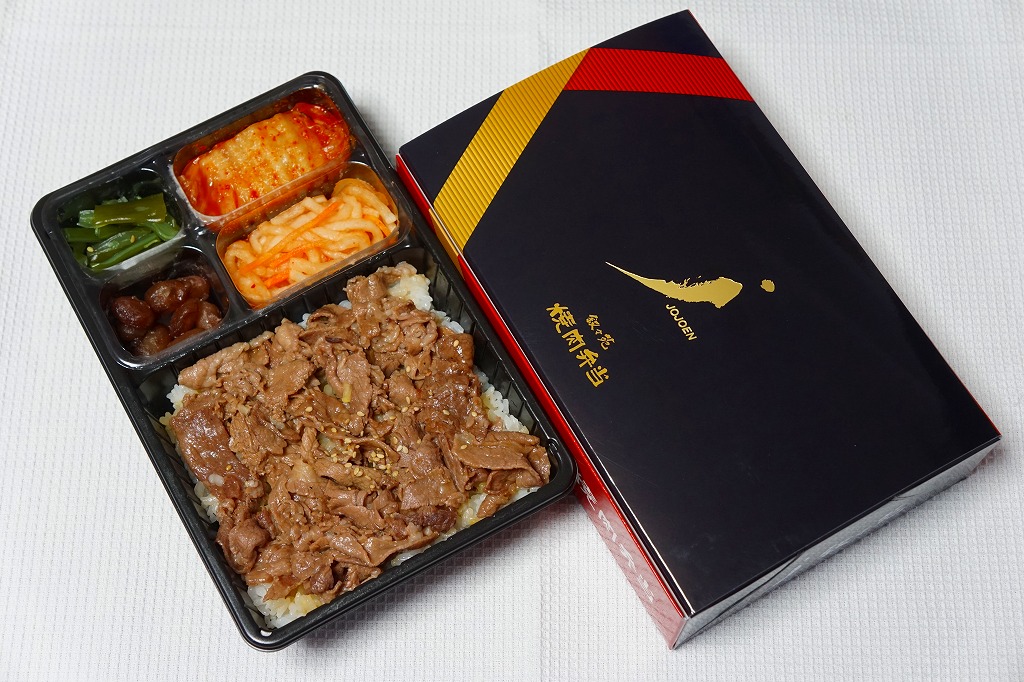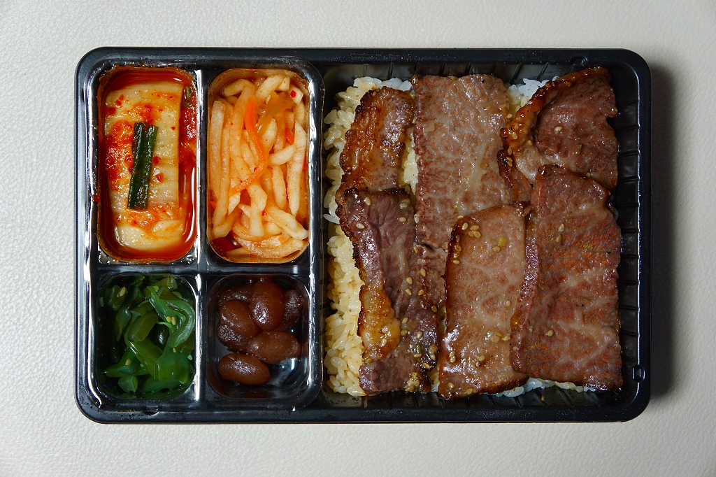 2006(平成18)年の東京駅弁デビューか。東京都心で芸能人に人気がある高級焼肉チェーン店と東京駅のキヨスクがタイアップした、韓国風焼肉弁当。見るからに高級そうな厚手の専用紙箱に透明のトレーを入れて、白御飯に焼肉6切れを載せる焼肉丼と、キムチ、茎ワカメ、大根ナムル、金時豆を詰める。価格は発売時で2,100円、2011年時点2,300円、2014年4月の消費税率改定で2,365円。