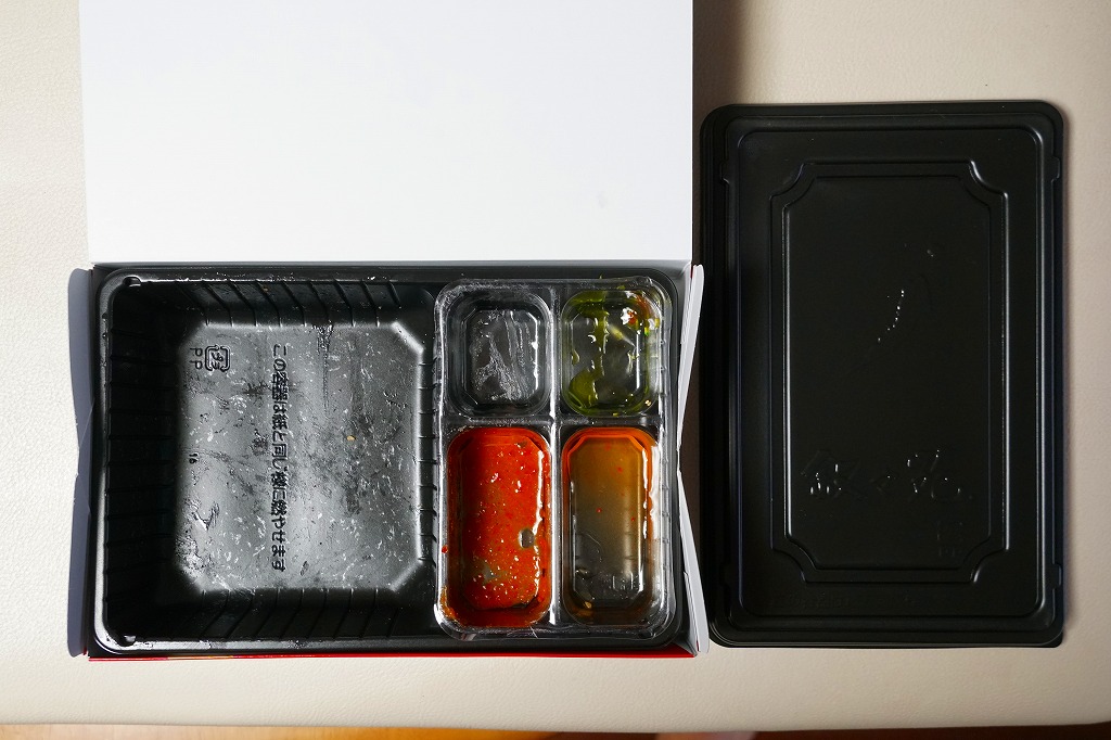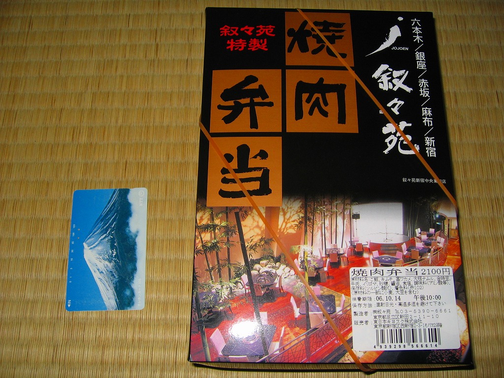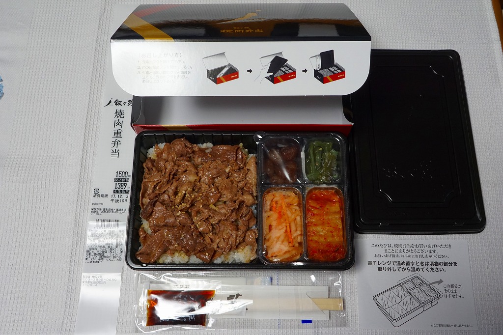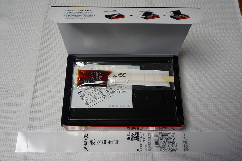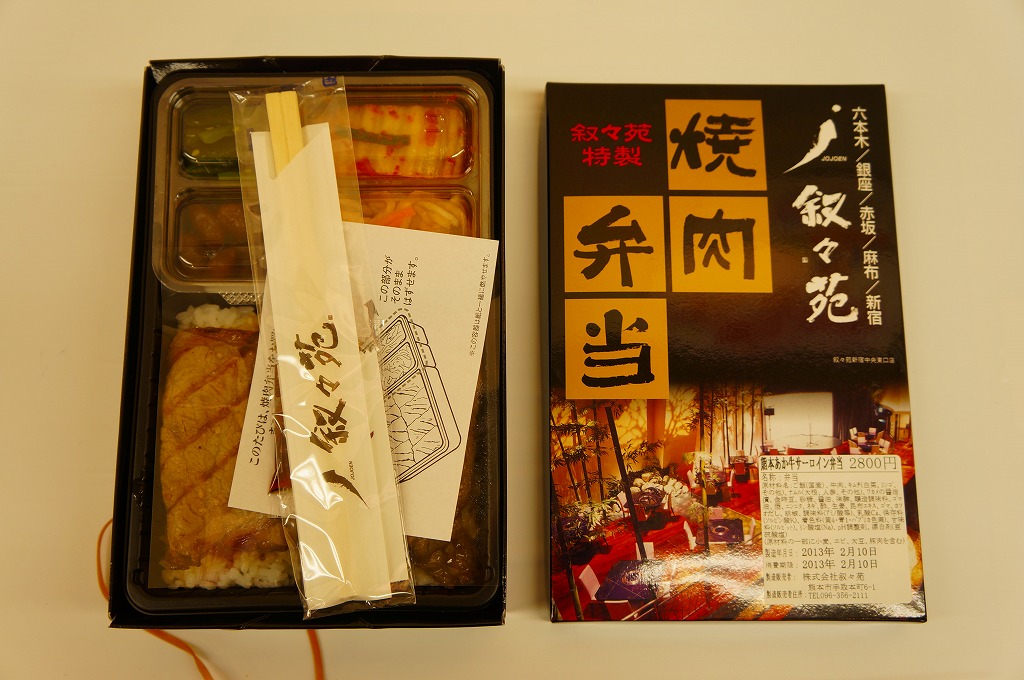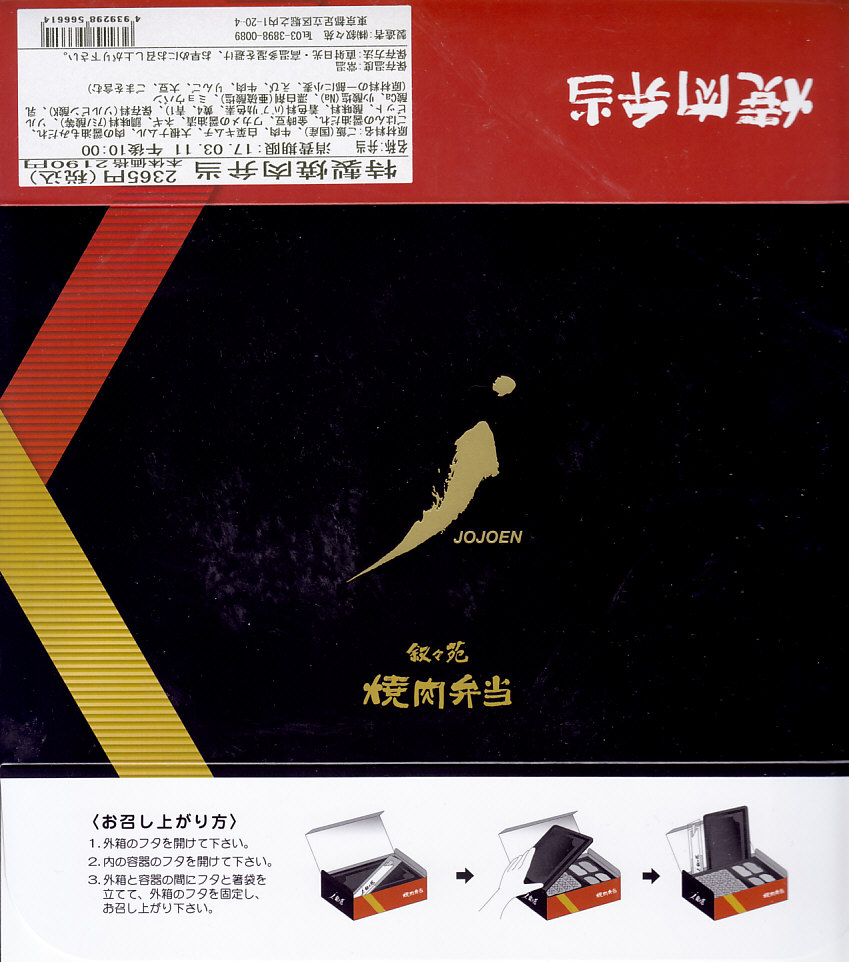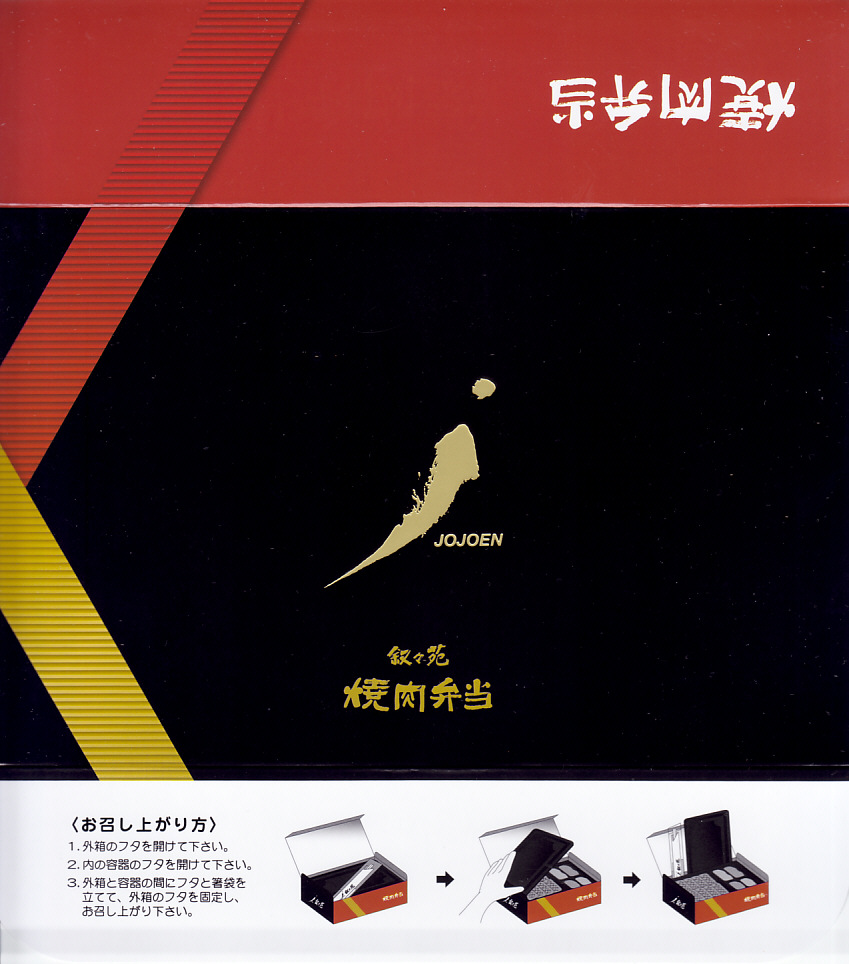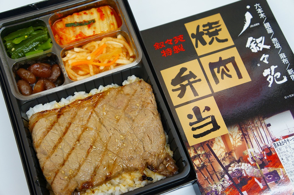 2006(平成18)年の東京駅弁デビューか。東京都心で芸能人に人気がある高級焼肉チェーン店と東京駅のキヨスクがタイアップした、韓国風焼肉弁当。見るからに高級そうな厚手の専用紙箱に透明のトレーを入れて、白御飯に焼肉6切れを載せる焼肉丼と、キムチ、茎ワカメ、大根ナムル、金時豆を詰める。価格は発売時で2,100円、2011年時点2,300円、2014年4月の消費税率改定で2,365円。