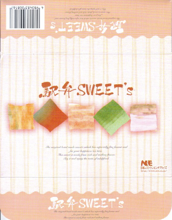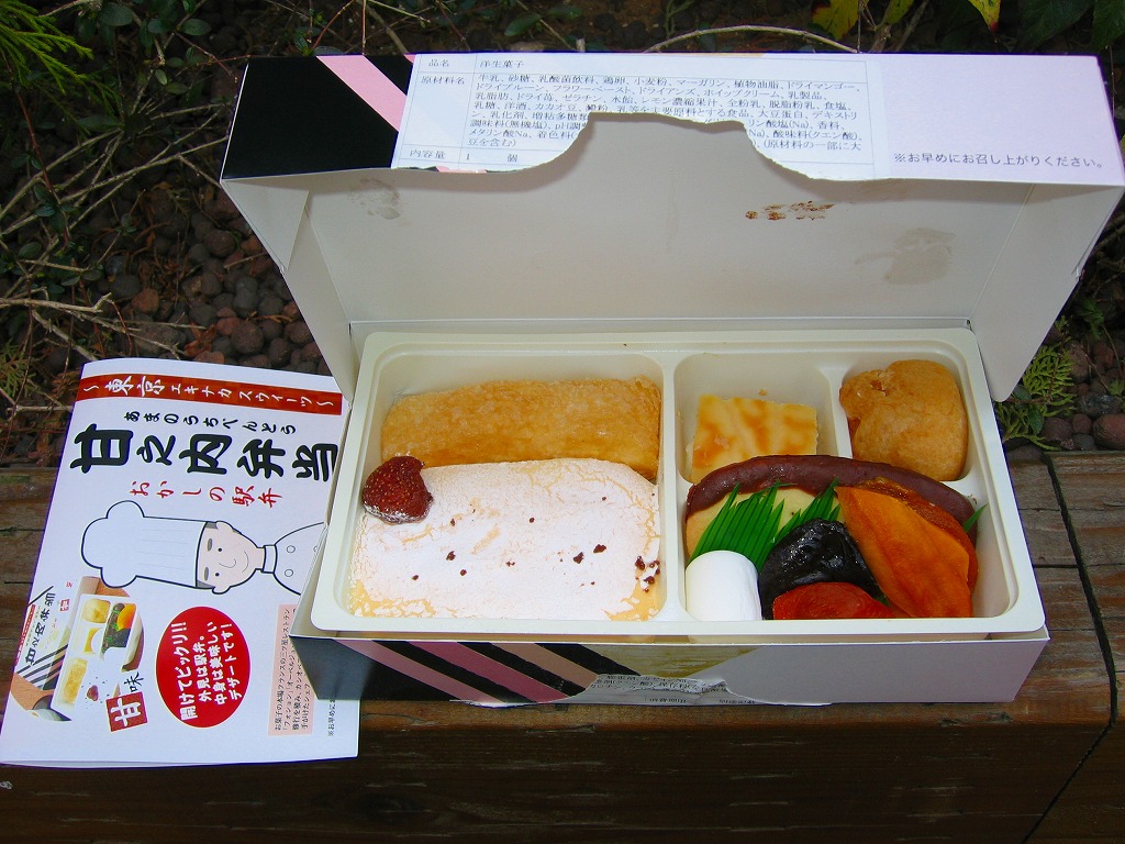 テレビゲーム「桃太郎電鉄」のさくまあきら氏がウェブ上の日記で感心されていたその商品名は、パッケージで「駅弁SWEET’s」、お品書きで「駅弁すぃーつ」、公式サイトで「駅弁スイーツ」と、微妙に表記や読み方が異なる。数か月間の販売か。