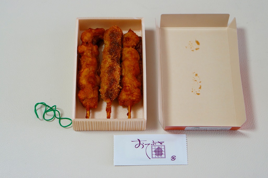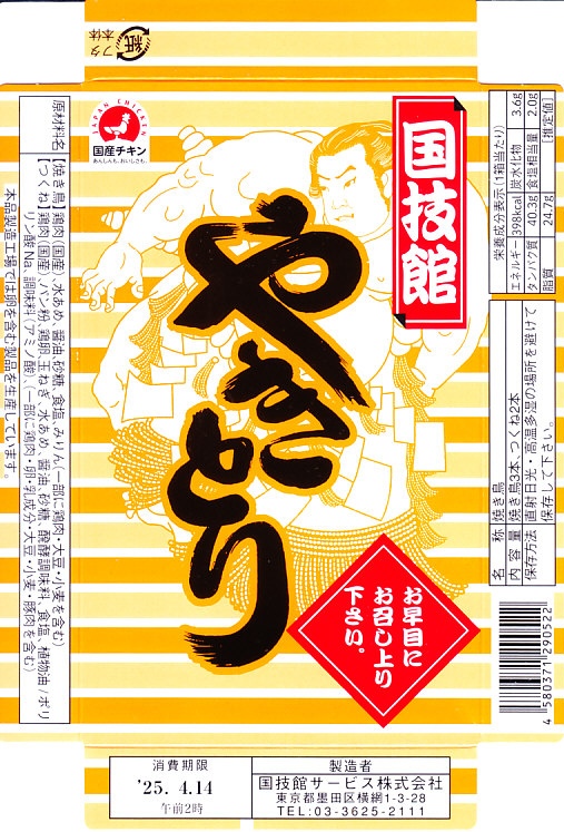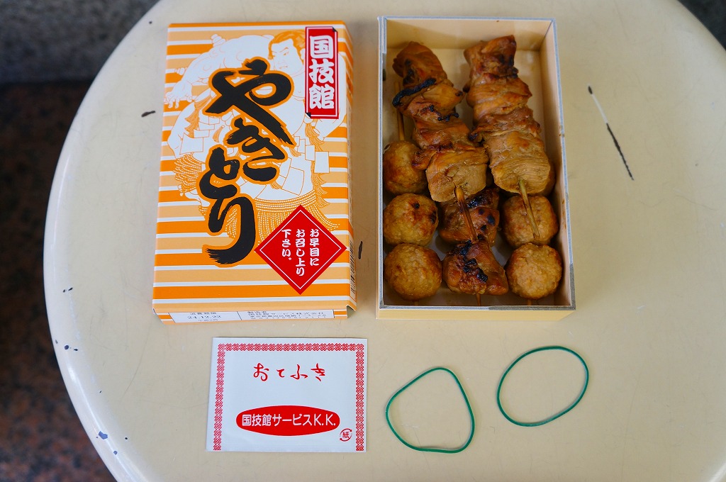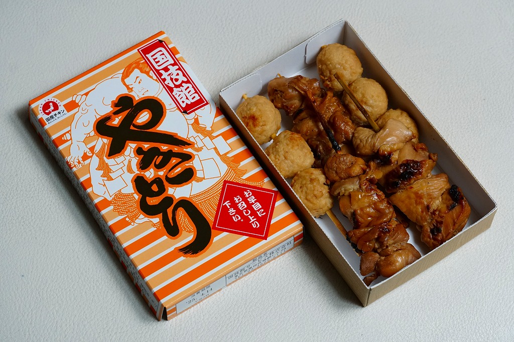 1950年代から国技館での大相撲観戦の名物となっている焼き鳥が、2012(平成24)年8月の東京駅の駅弁売店「駅弁屋 祭」オープンとともに、東京駅構内でも販売されるようになったもの。厚く小さな紙箱の中に、焼き鳥が3本、つくね串が2本、コンパクトに収まる。現在は東京両国の国技館で、土俵の真下の地下工場で製造されているそうな。