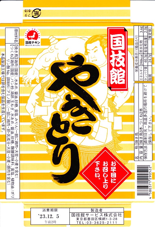 上記の商品「国技館やきとり」の、2023(令和5)年時点での姿。上記の2025年のものと、まったく変わらない。今後も変わらないのだろうと思う。値段も同じ。