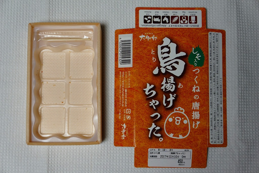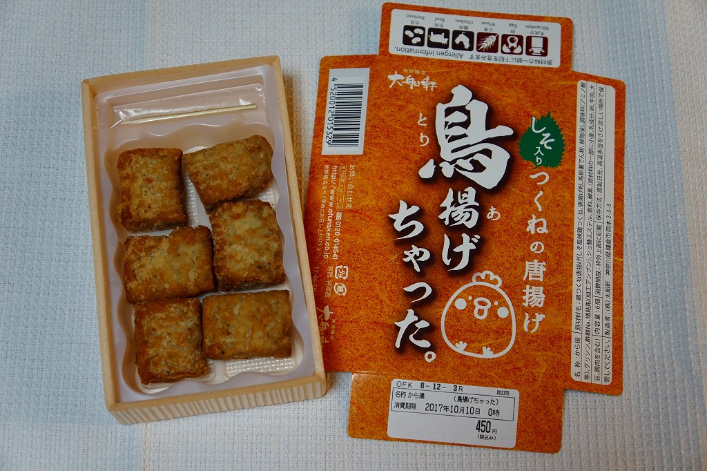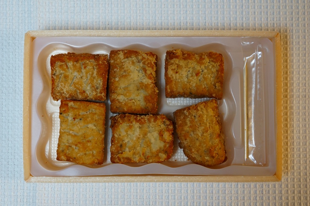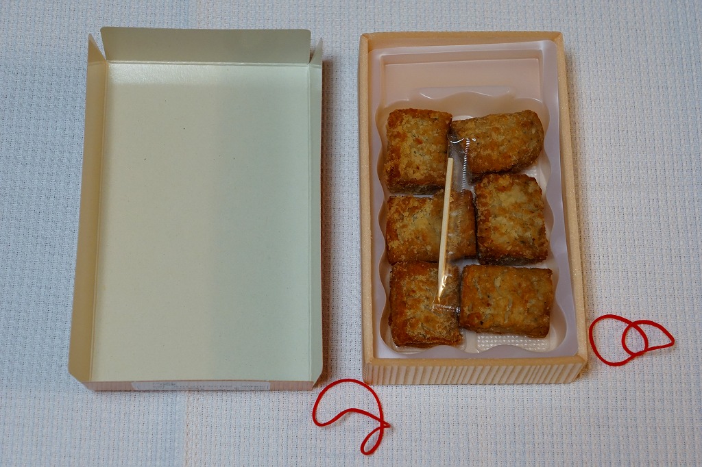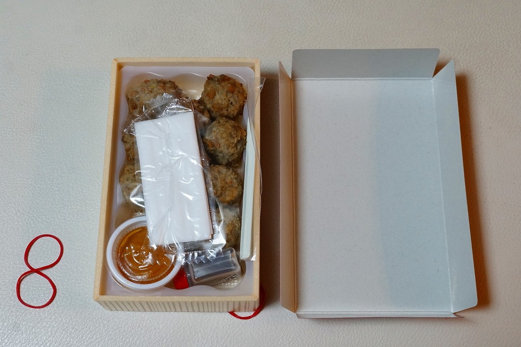 2017(平成29)10月に東京駅の駅弁売店「駅弁屋 祭」で発売か。森駅弁「いかめし」や、「国技館やきとり」「チキン弁当のからあげ」「三崎マグロの串揚げ」などと同じような、この駅弁売店でのレジ横商品。一口チョコ大に整形された、しそ入り鳥つくね唐揚げが、小さな箱の中のトレーに収まる。これで6個で450円かと思うと、かなりの割高感。2018(平成30)年1月頃までの販売か。