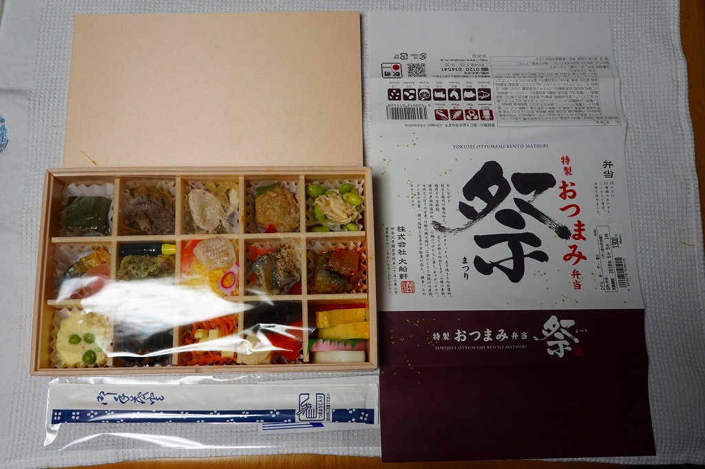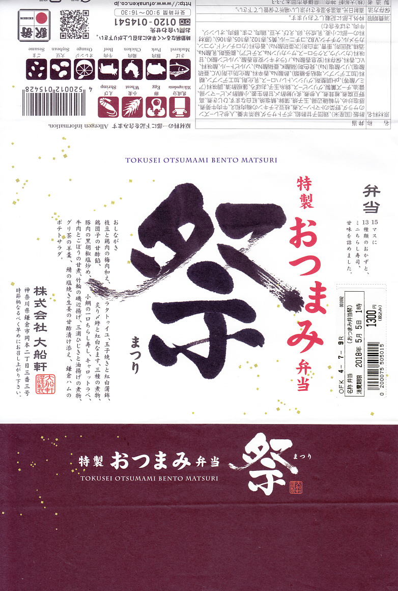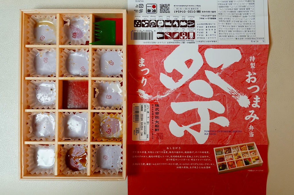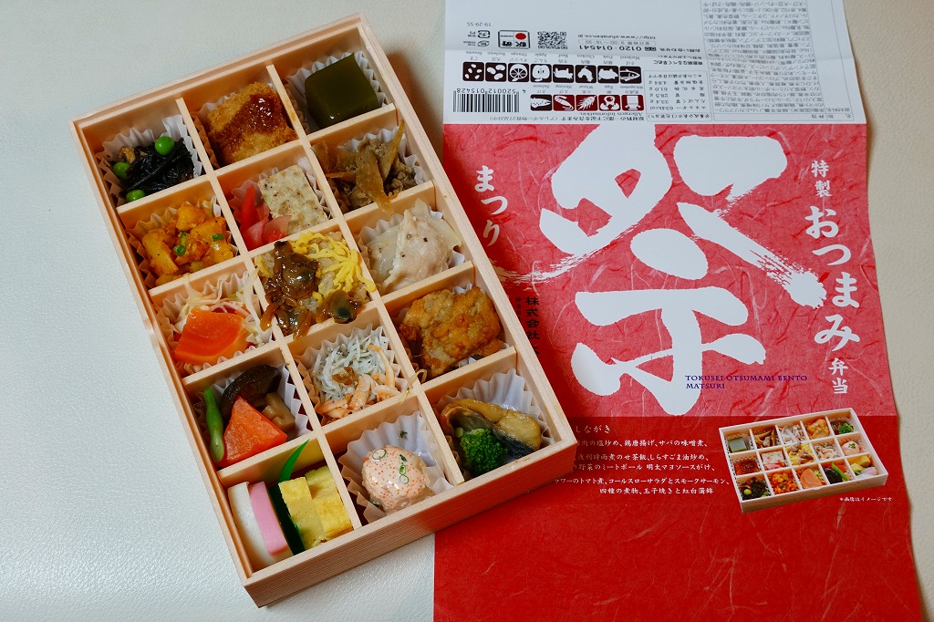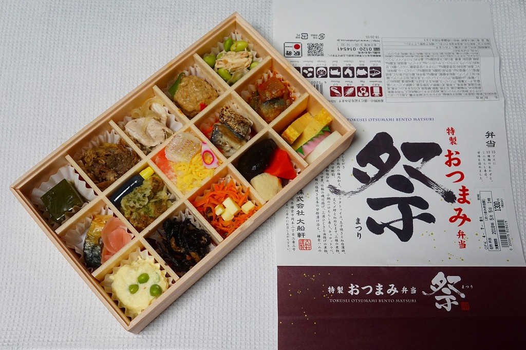 下記の駅弁「特選おつまみ弁当祭」を、2019(令和元)年9月に買ったもの。名前と値段と容器は同じで、掛紙が赤くなり、中身の半分弱が入れ替わっていた。掛紙の上面から側面へ移動したおしながきを転記すると、「グリ茶の羊羹」「牛肉とごぼうの旨煮」「豚肉の塩炒め」「鶏唐揚げ」「サバの味噌煮」「三崎マグロカツ」、「鶏肉の野菜入りパテ」「浅利時雨煮のせ茶飯」「しらすごま油炒め」「彩り野菜のミートボール明太マヨソースがけ」「三浦ひじき煮」「鎌倉ハムとカリフラワーのトマト煮」「コールスローサラダとスモークサーモン」「四種の煮物」「玉子焼きと紅白蒲鉾」で15区画。JR東日本グループ会社の事業再編という不思議な理由により、2021年3月限りで終売。